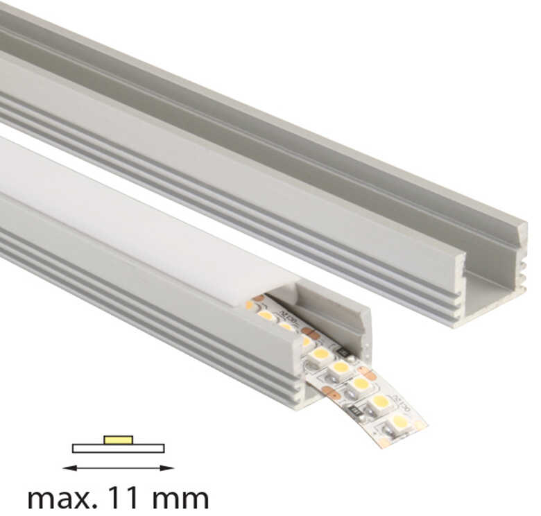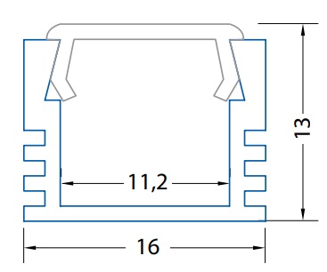 Přisazený hliníkový profil pro LED pásky, rozměry průřezu cca 16x13 mm. Součástí je mléčný difuzor, který lze do profilu nacvaknout. Tento profil je určen pro krytí a chlazení LED pásků do šíře 11 mm. Upevnění k podkladu lze provést pomocí montážních úchytů, vrutů, lepidel.