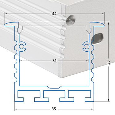 Vestavný hliníkový profil pro sádrokarton, rozměry průřezu cca 44x35mm. Součástí je mléčný difuzor, který lze do profilu nacvaknout. Tento profil je určen pro krytí a chlazení LED pásků do šíře až 30mm a výkonu max. 38,4W/m. Pomocí samostatně prodávaných konektorů možnost spojení více profilů za sebou nebo do úhlu 90°. Profil lze upevnit pomocí samostatně prodávaných pérek, případně jej lze přivrtat nebo přilepit. K profilu lze zakoupit také koncovky. Délka 2m.