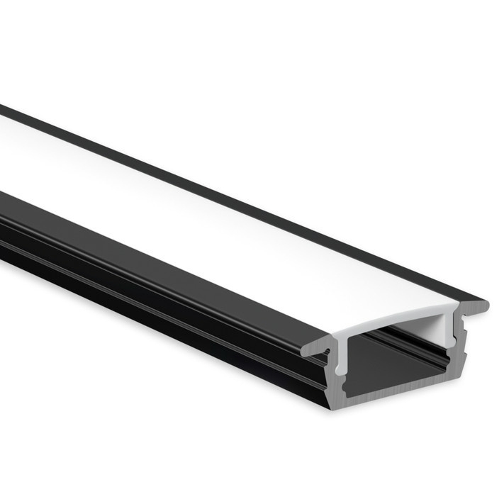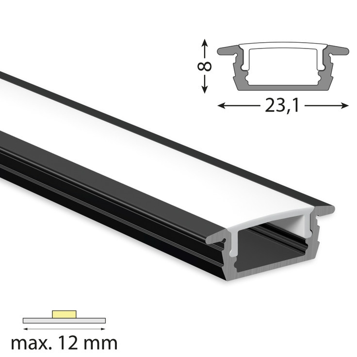 McLED ML-761.373.43.2 Vestavný hliníkový profil černý pro LED pásky, rozměry průřezu cca 23x8 mm. Součástí je mléčný difuzor, který lze do profilu nacvaknout. Tento profil je určen pro krytí a chlazení LED pásků do šíře 12 mm. Upevnění k podkladu lze provést pomocí vrutů, lepidel. K profilu lze zakoupit koncovky.