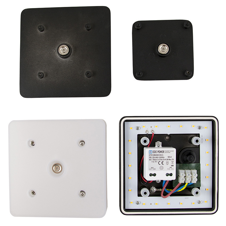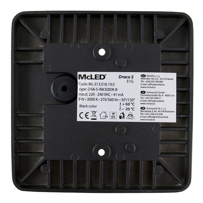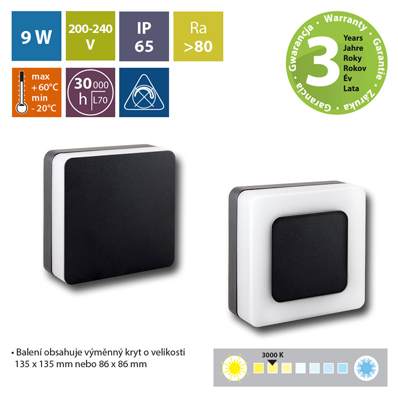LED nástěnné a fasádní svítidlo Draco S, součástí balení dva druhy magnetických krytů, černá barva, 9W, 230V, IP65, teplá bílá (3000K), světelný tok až 562lm, vyzařovací úhel 52/127°, CRI80, životnost až 30.000h, rozměry 145 x 145 x 53, materiál hliník/plast, nestmívatelné.