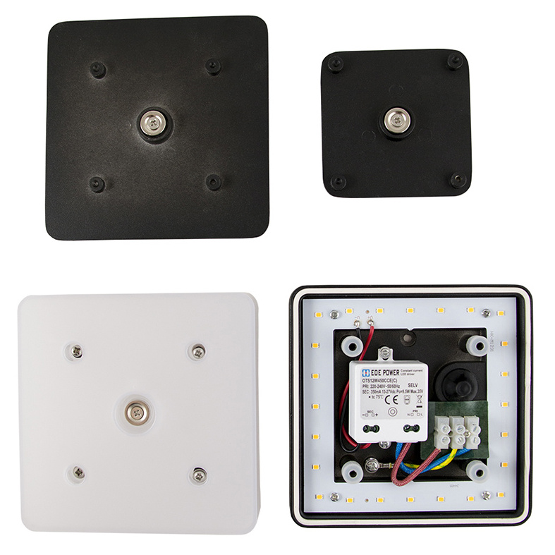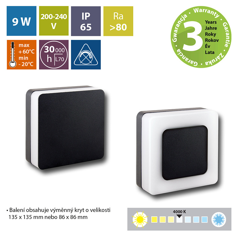 LED nástěnné a fasádní svítidlo Draco S, součástí balení dva druhy magnetických krytů, černá barva, 9W, 230V, IP65, neutrální bílá (4000K), světelný tok až 605m, vyzařovací úhel 53/128°, CRI 80, životnost až 30.000h, rozměry 135x135x48, materiál hliník/plast, nestmívatelné.