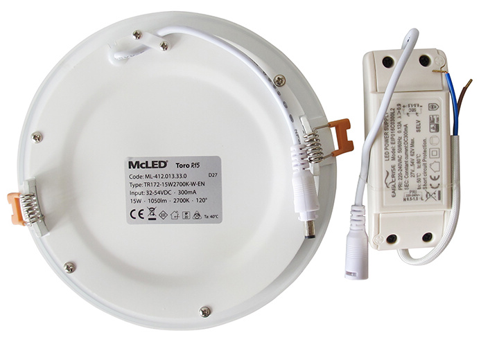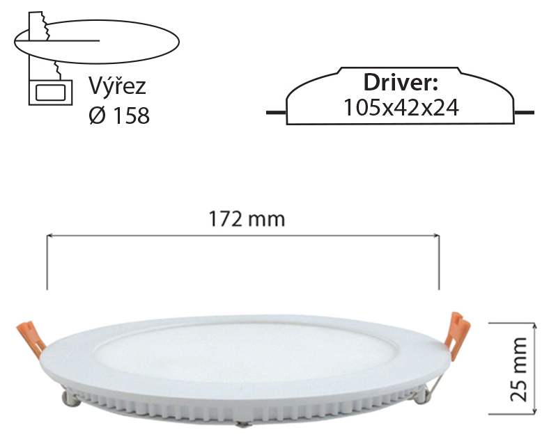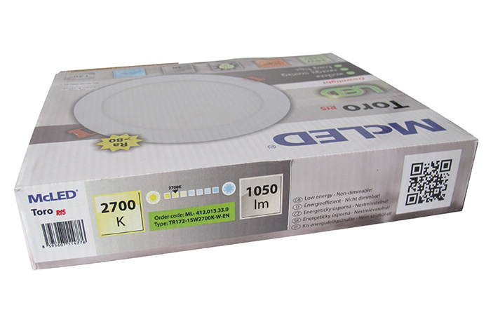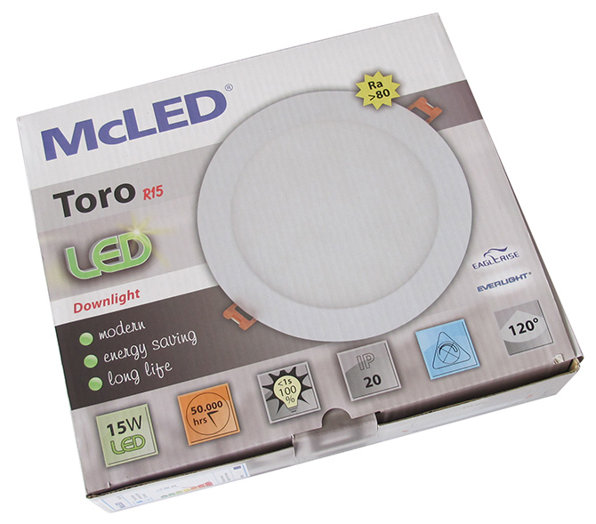 LED podhledové svítidlo 15W, (ekvivalent 1x26W CFL, úspora až 45%), 230V, IP20, 2700K - teplá bílá, světelný tok 1050lm, vyzařovací úhel 120°, Ra>80, životnost až 50.000h, rozměry ø 172x25, materiál hliník/plast, nestmívatelné, PF>0,9