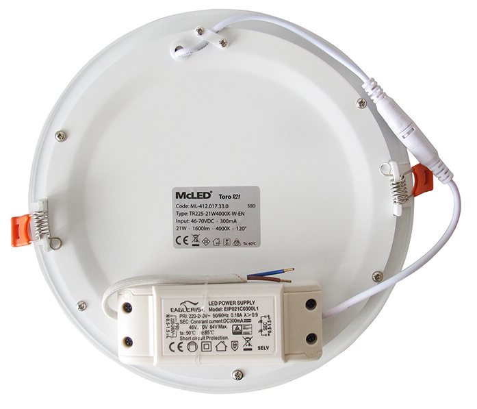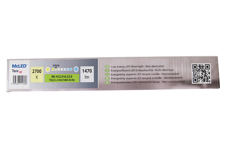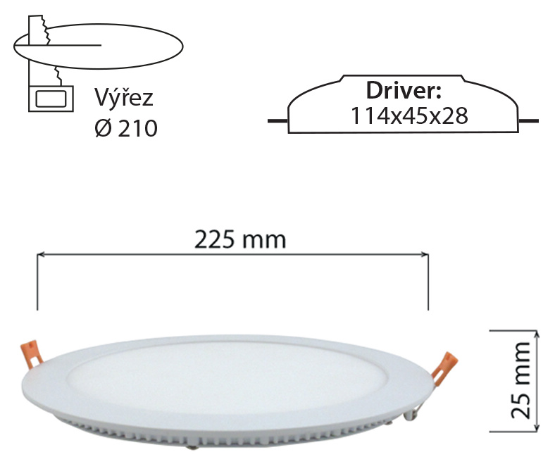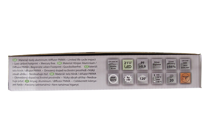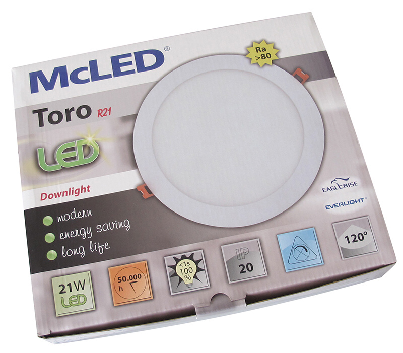 LED podhledové svítidlo 21W, (ekvivalent 2x18W CFL, úspora až 45%), 230V, IP20, 2700K - teplá bílá, světelný tok 1470lm, vyzařovací úhel 120°, Ra>80, životnost až 50.000h, rozměry ø 225x25, materiál hliník/plast, nestmívatelné, PF>0,9
