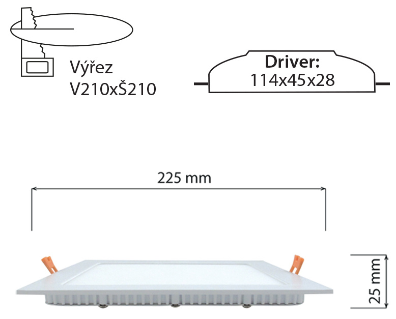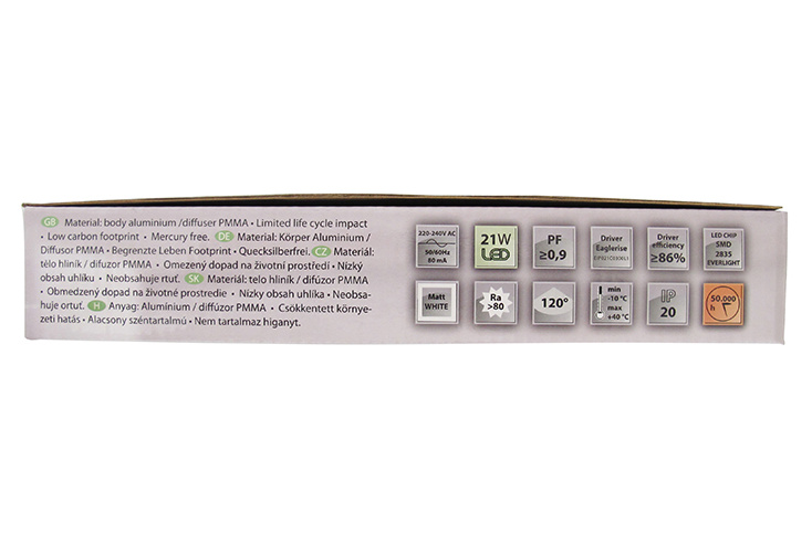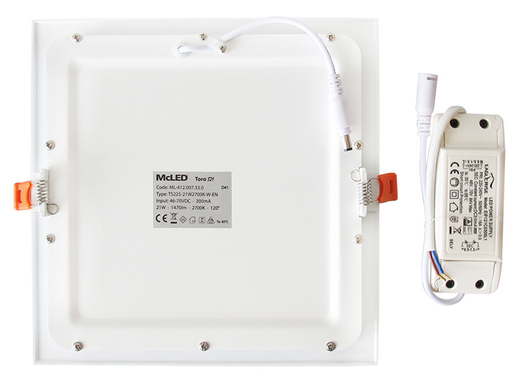 LED podhledové svítidlo 21W, (ekvivalent 2x18W CFL, úspora až 45%), 230V, IP20, 4000K - neutrální bílá, světelný tok 1600lm, vyzařovací úhel 120°, Ra>80, životnost až 50.000h, rozměry 225x225x25, materiál hliník/plast, nestmívatelné, PF>0,9