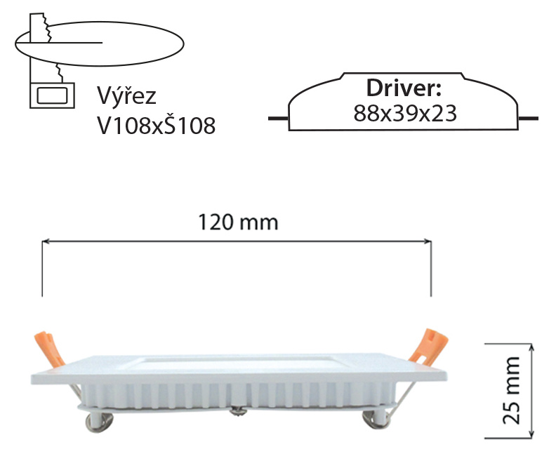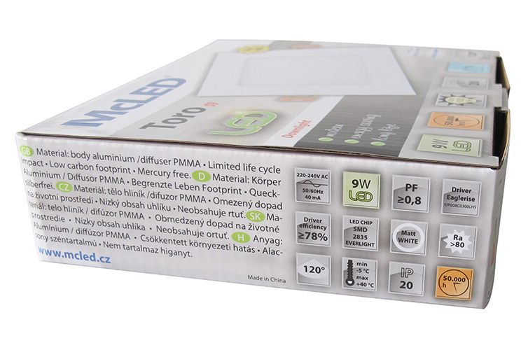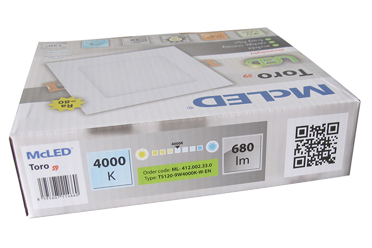 LED podhledové svítidlo 9W, (ekvivalent 1x18W CFL, úspora až 45%), 230V, IP20, 4000K - neutrální bílá, světelný tok 680lm, vyzařovací úhel 120°, Ra>80, životnost až 50.000h, rozměry 120x120x25, materiál hliník/plast, nestmívatelné, PF>0,8
