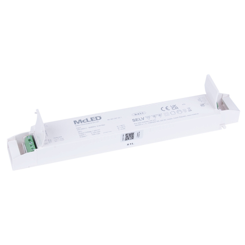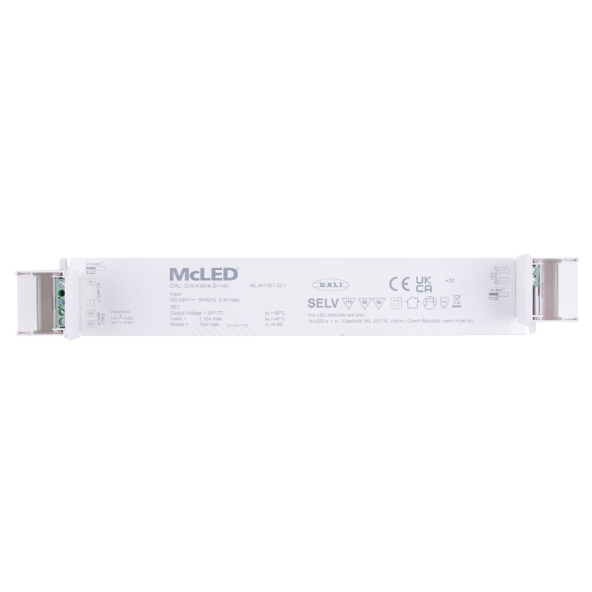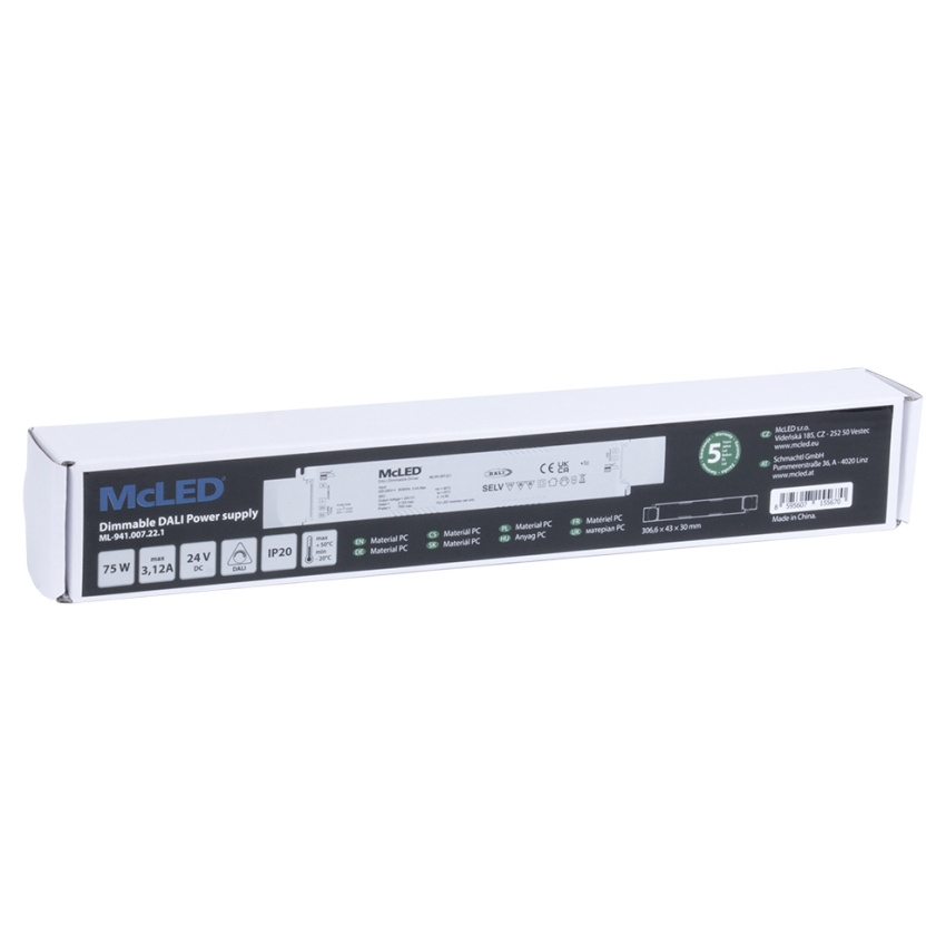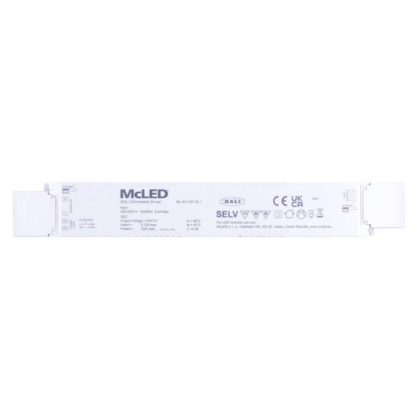 Stmívatelný napěťový zdroj pro LED pásky - výkon 75W, výstupní napětí DC 24V, proud max. 3,125A. IP20. Vstupní napětí 220 - 240V AC, materiál krytu: plast. Rozměry 307x43x30mm, hmotnost 318g. Stmívání pomocí DALI nebo tlačítkem. Při výběru zdroje počítejte s výkonovou rezervou min. 20%. Doba náběhu cca 0,5 - 2s. Certifikace: CE, SELV, MM.