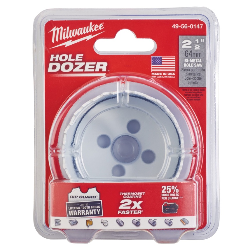 Kruhová pilka MILWAUKEE HOLE DOZER, Ø 64 mm, max. hloubka řezání 41 mm, bimetalová konstrukce.