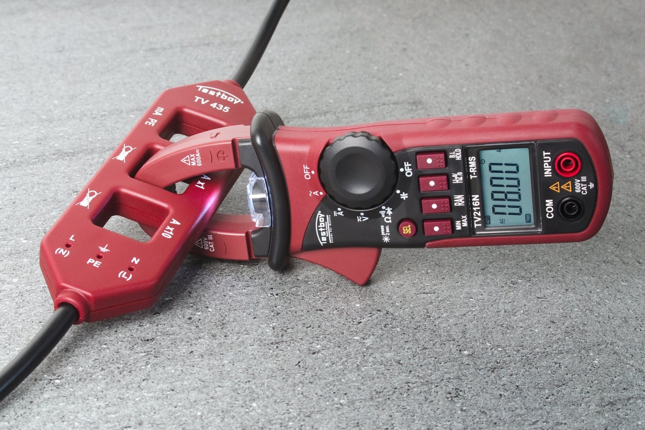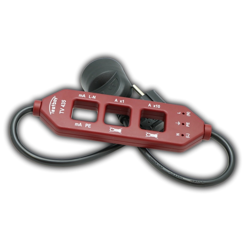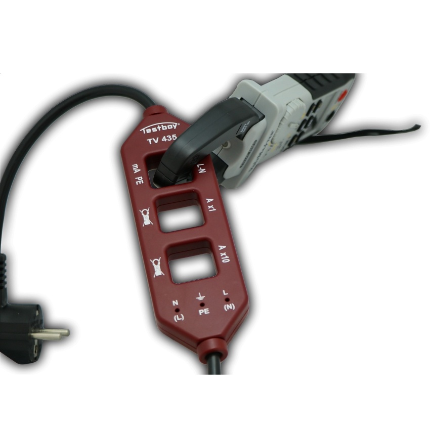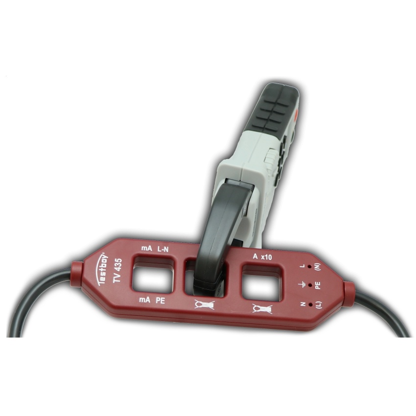 Adaptér pro měření proudu Testboy® TV 435 je adaptér pro testování různých měřených hodnot spotřebiče. Díky jednoduchosti lze adaptér snadno připojit mezi spotřebič a zásuvku. Pomocí klešťového ampérmetru lze určit jednorázový a desetinásobný zatěžovací proud, rozdílový proud mezi vnějším a nulovým vodičem a proud na ochraném vodiči. Poměry napětí mezi připojenými vodiči lze také zjistit pomocí integrovaných měřicích bodů.