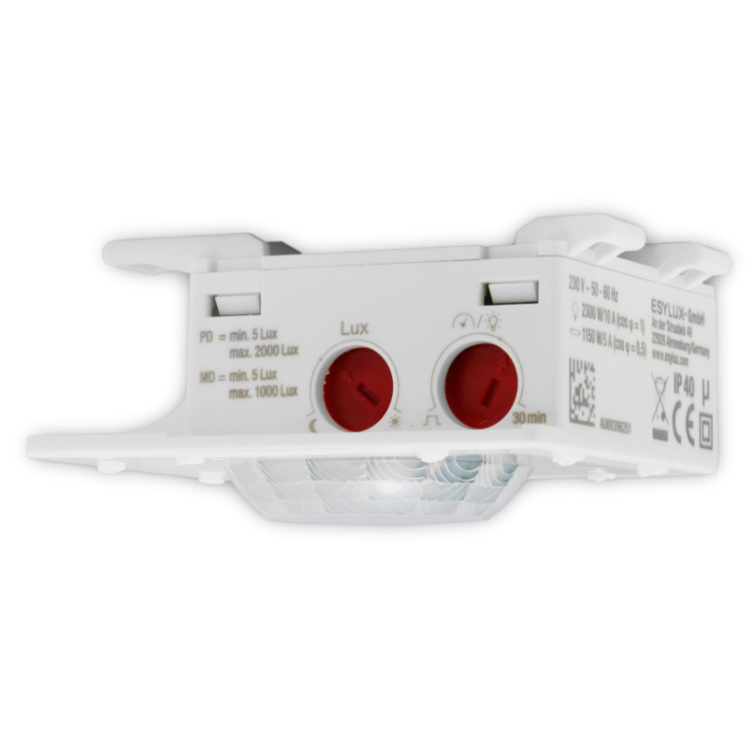 Čidlo přítomnosti ESYLUX PD 360/24 BASIC je moderní kompaktní detektor přítomnosti osob vyráběný v Německu. Citlivost na pohyb je u čidla přítomnosti mnohem vyšší než u čidla pohybu a registruje i sebemenší pohyby. Měření intenzity osvětlení v místnosti probíhá neustále. Při dosažení nastavené meze světelných podmínek je čidlo schopné vypnout i tehdy, když stále registruje pohyb (přítomnost) a tím dále šetří el. energii. Čidlo vyniká jednoduchou pohodlnou montáží, spínáním při průchodu napětí nulou, extrémně nízkou spotřebou < 0,2 W a 5 letou zárukou. Vysoce výkonné relé 10 A spíná všechny druhy svítidel včetně LED. Barva čidla bílá - RAL 9010. Díky funkci spínání při průchodu napětí nulou je čidlo šetrné k vlastnímu relé i ke spínaným světelným zdrojům a tím výrazně prodlužuje jejich životnost. Čidlo je určené pro použití v menších místnostech a chodbách vč. schodišť. Montáž na strop, při doporučené montážní výšce 3 m (min. 2,5 m, max. 5 m). - rychlá instalace díky odnímatelné montážní základně, násuvné přístrojové části a bajonetovému zámku krytu čidla - dosah čidla je 8 m v průměru, kruhový záběr 360° a detekční plocha až 50 m2 - dobu sepnutí lze nastavit v rozmezí 15 s - 30 min, případně nastavit pouze krátký impuls - rozsah vyhodnocení jasu 5 - 2000 Lux - zpoždění sepnutí / vypnutí ze "tmy na světlo" 300 s - zpoždění sepnutí / vypnutí ze "světla do tmy" 30 s - výkonové relé, krátkodobě zatížitelné spínacím proudem až 78 A (5 ms) - průřez vodičů pro připojení 1,5 - 2,5 mm2 - tovární přednastavení času doběhu a míry soumraku pro okamžité uvedení do provozu - k čidlu lze připojit externí spínací tlačítko pro možnost manuálního ovládání „4 h ZAP/VYP“ Rozsah spínání 230 V/50 Hz 2300 W/10 A (cos phi = 1) 1150 VA/5 A (cos phi = 0,5) 600 W LED Dostupné příslušenství pro: montáž čidla na instalační lištu (distanční podložky vysoké 16mm) – obj. kód EB10423130 vymezení detekční oblasti zakrytím části čočky (clonka) - obj. kód EB10423093 Na obalu čidel MD 360 je umístěn QR-kód s odkazem na montážní video v češtině.