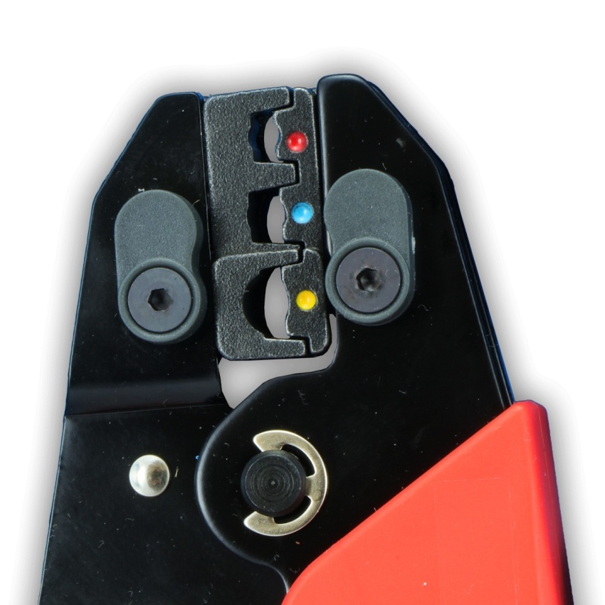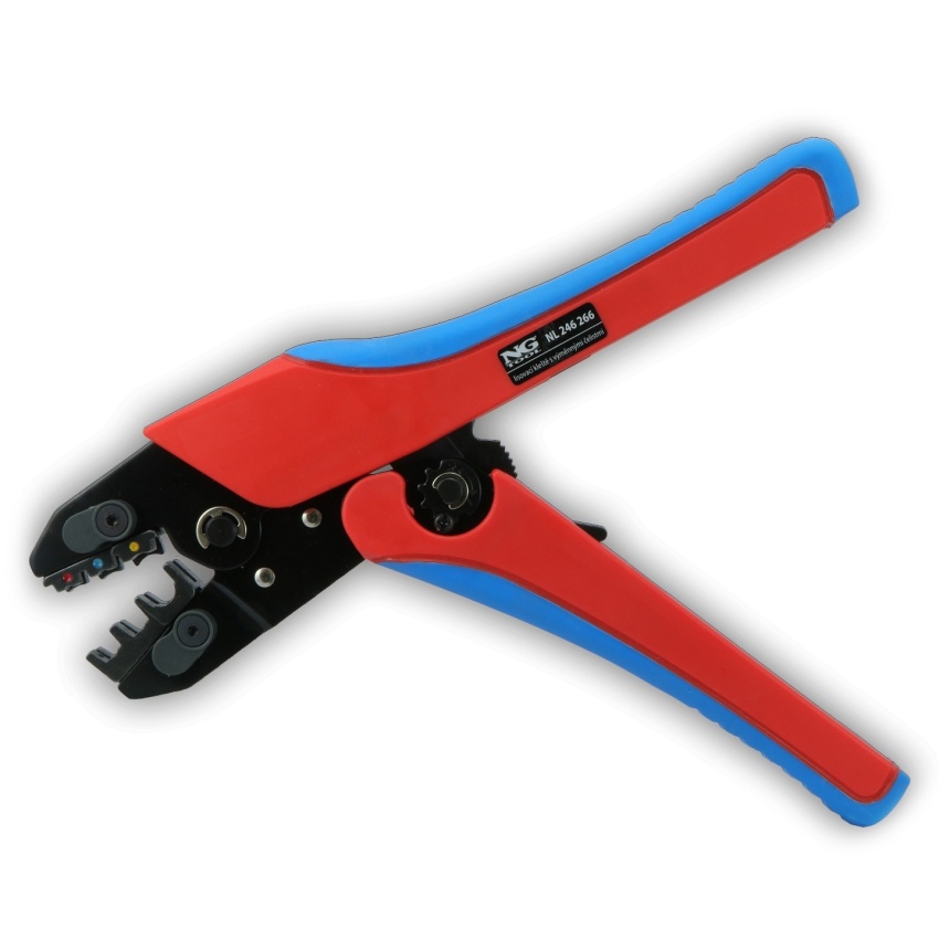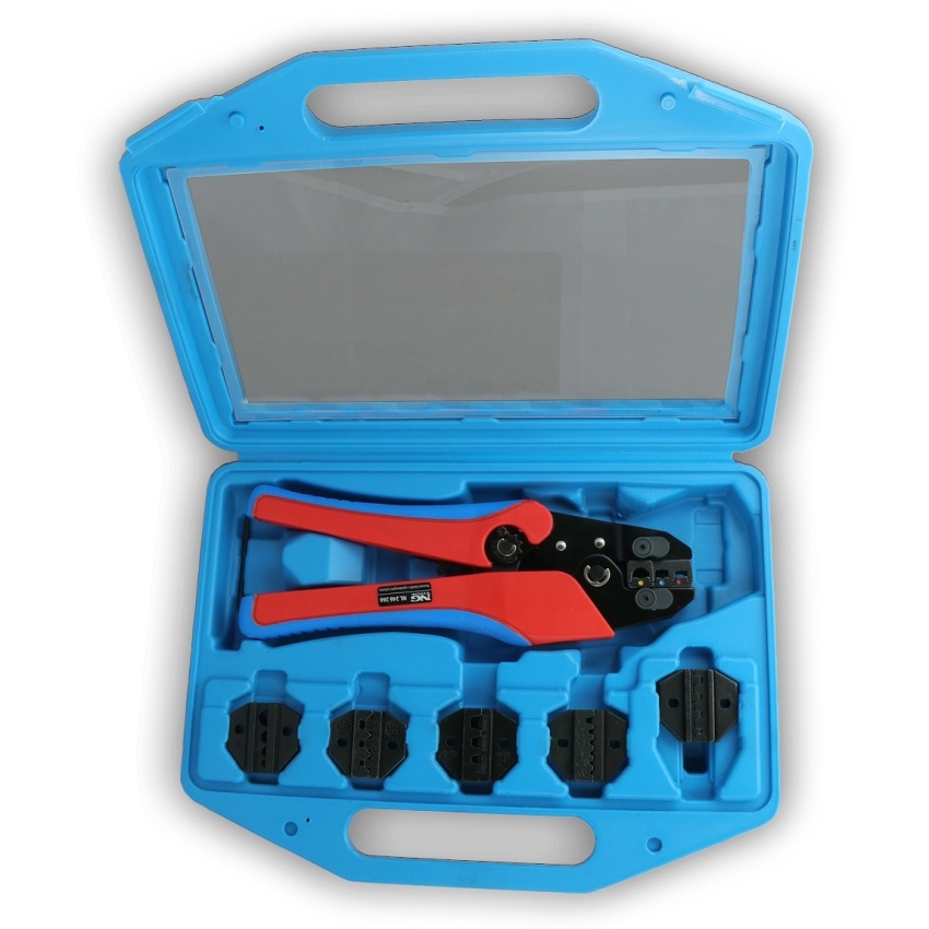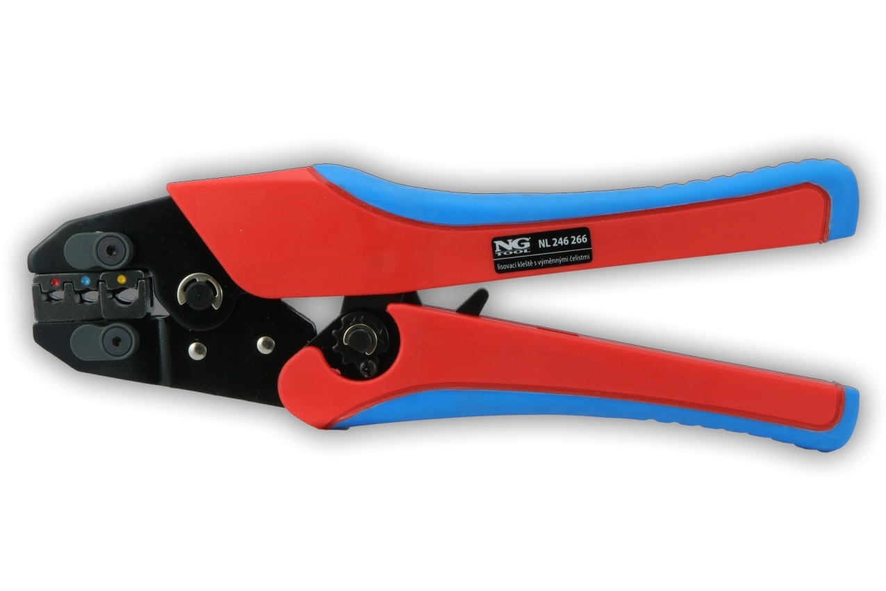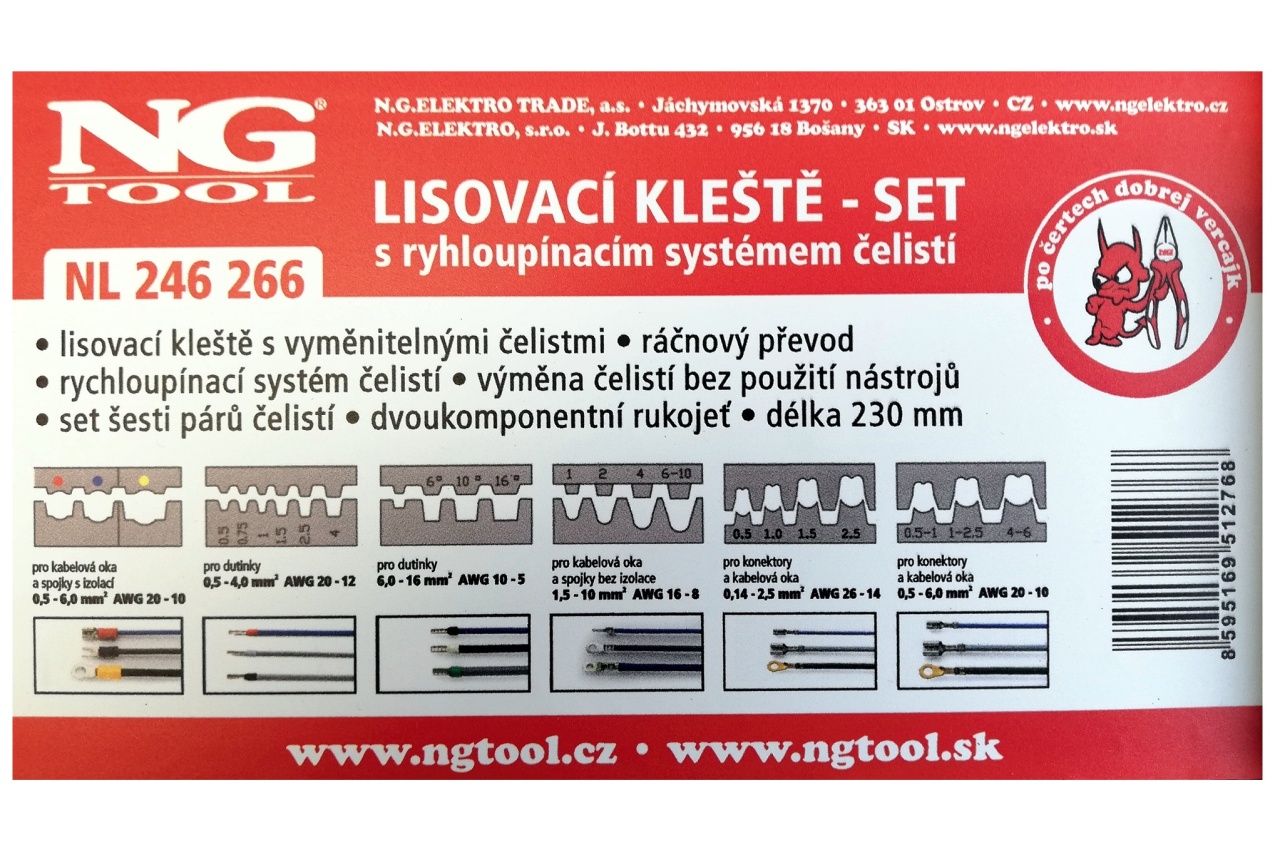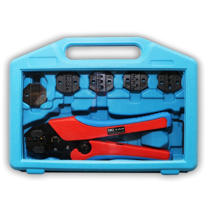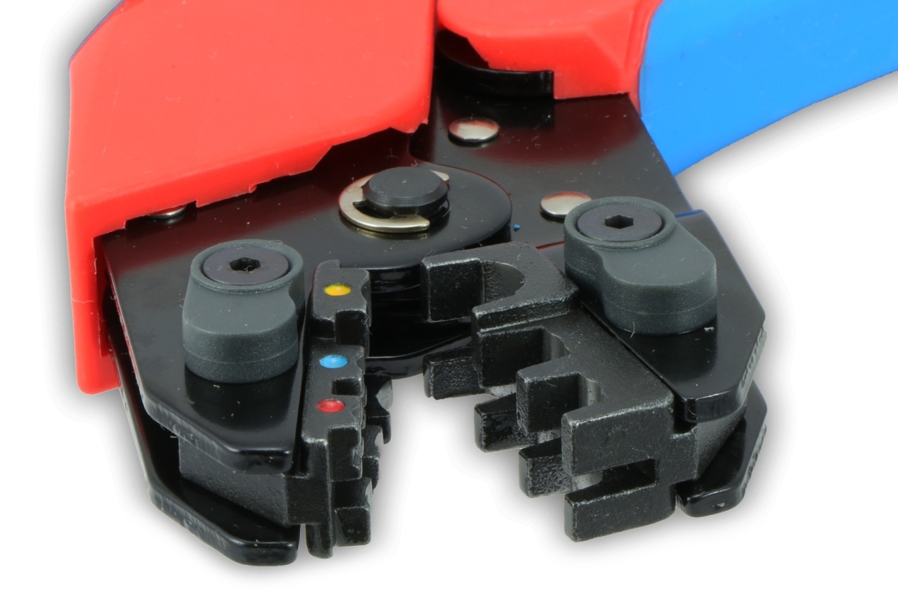 Sada lisovacích kleští s ráčnovým převodem a s výměnnými čelistmi pro pohodlné lisování základních kabelových koncovek a spojek. Rychlá a snadná výměna čelistí bez použití nástroje. Inovovaná komfortní dvoukomponentní rukojeť speciálně tvarovaná proti sklouznutí ruky směrem k čelisti.