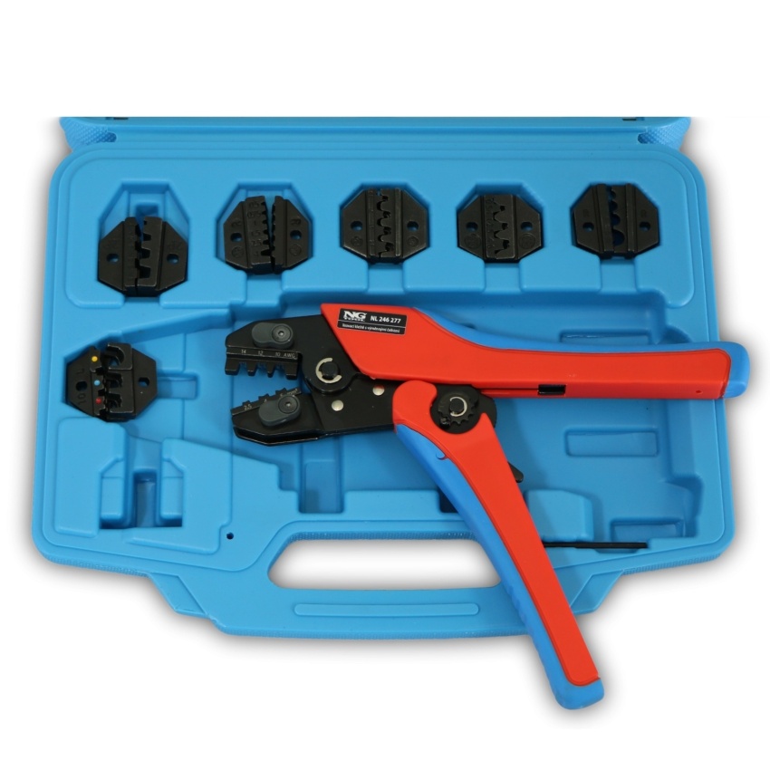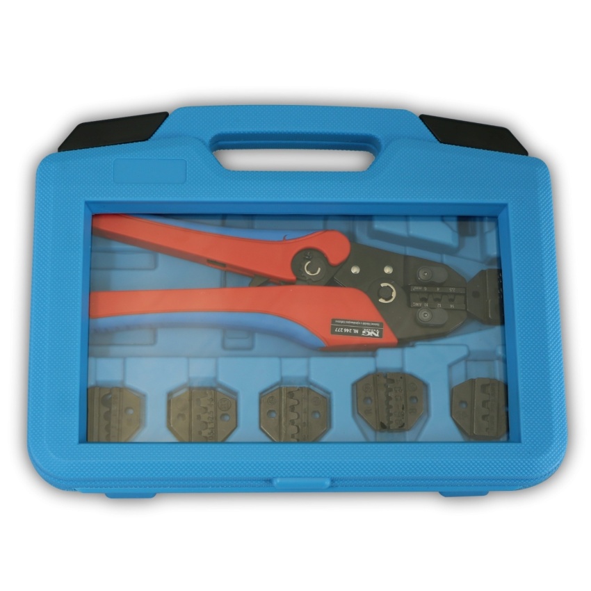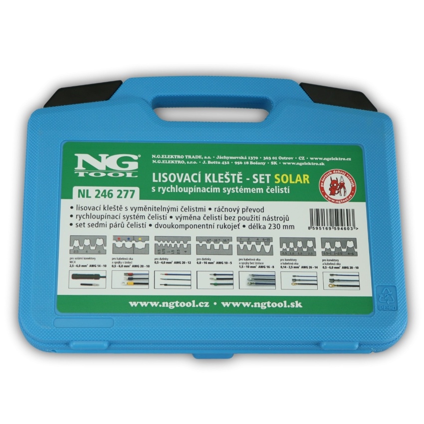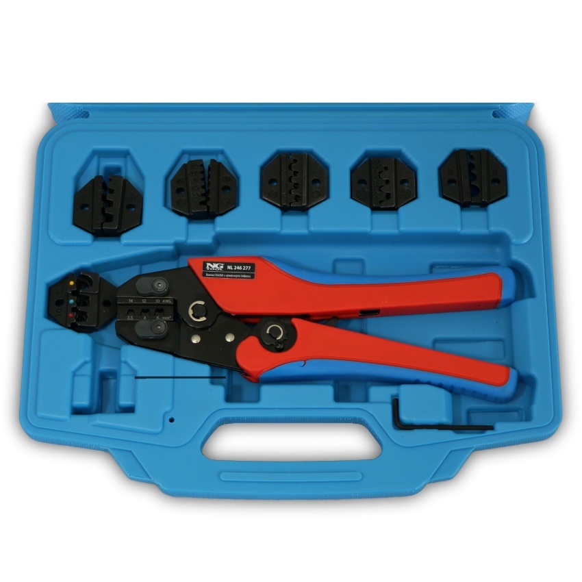 Sada lisovacích kleští s ráčnovým převodem a s výměnnými čelistmi pro pohodlné lisování konektorů, kabelových koncovek a spojek. Rychlá a snadná výměna čelistí bez použití nástroje. Inovovaná komfortní dvoukomponentní rukojeť speciálně tvarovaná proti sklouznutí ruky směrem k čelisti.