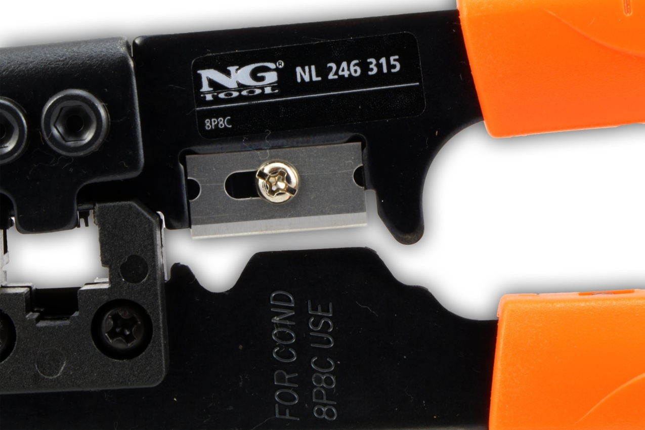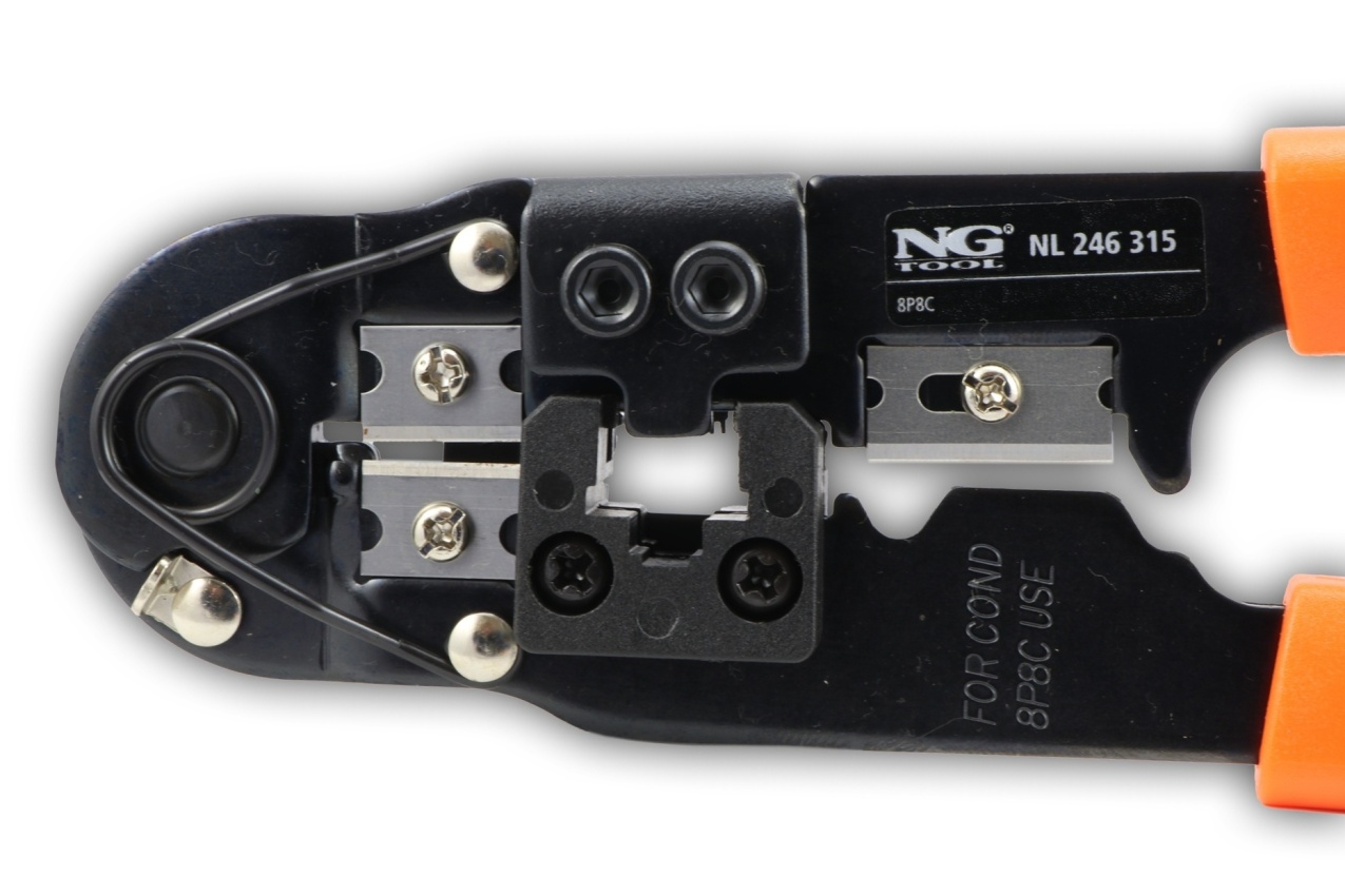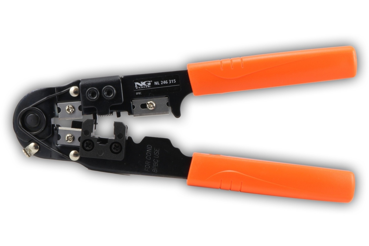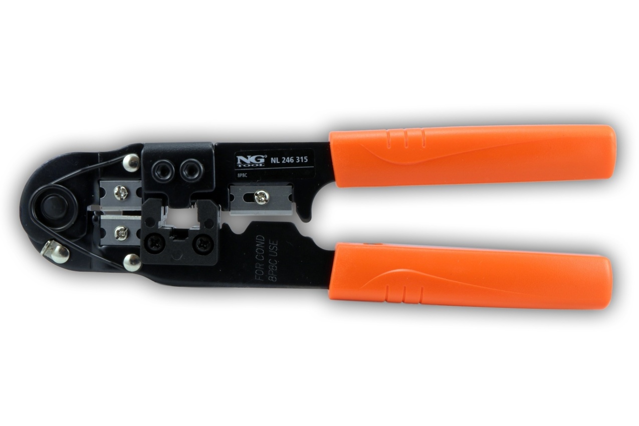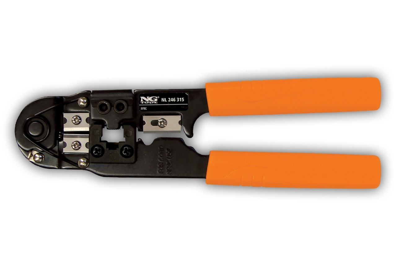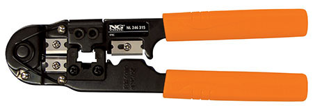 Ruční lisovací a odizolovací kleště pro práci s datovými konektory (typ RJ). Součástí kleští jsou střihací a odizolovací břity pro kompletní přípravu UTP kabelu k nalisování koncovky.