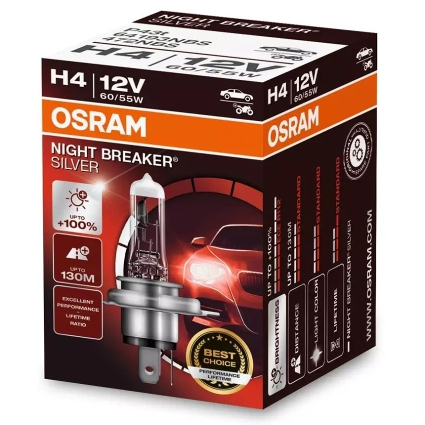 Autožárovka H4 Osram Night Breaker Silver poskytuje až 130 metrů dlouhý kužel světla a až o 100 % více jasu než běžné žárovky H4. Výkon homologovaných autožárovek s paticí P43t a dvěma spirálami je 55/60 W a napětí 12 V.