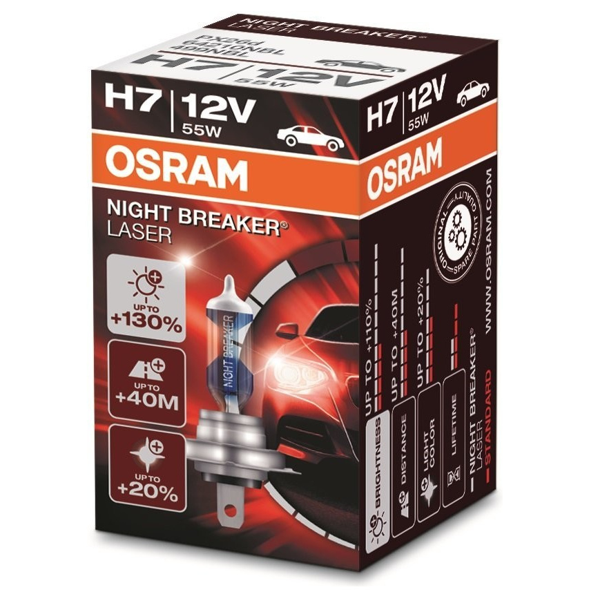 Autožárovka H7 Osram Night Breaker Laser poskytuje až 150 metrů dlouhý kužel světla a až o 20 % bělejší světlo ve srovnání s legislativou požadovaným minimálním standardem. Výkon autožárovek s paticí PX26d je 55 W a napětí 12 V.