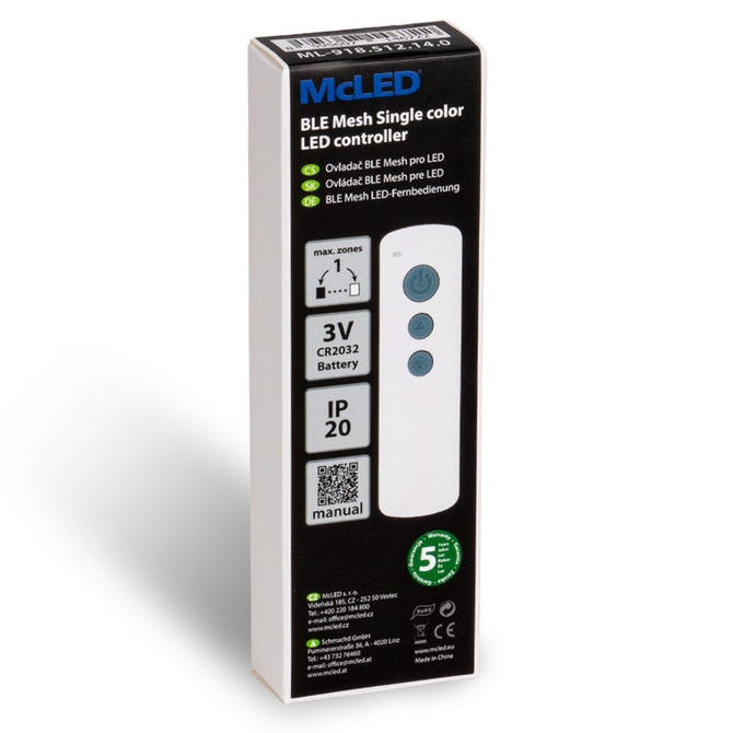 BLE Mesh dálkový ovladač pro řízení jasu (stmívání) jednobarevných LED pásků umožňuje řízení jedné skupiny BLE Mesh přijímačů (nejsou součástí), tato skupina může mít neomezeně přijímačů. Součástí balení je magnetický držák. Rozměry ovladače: 122×35×10mm, napájení 1x CR2032 baterie (součástí), dosah cca 20m.