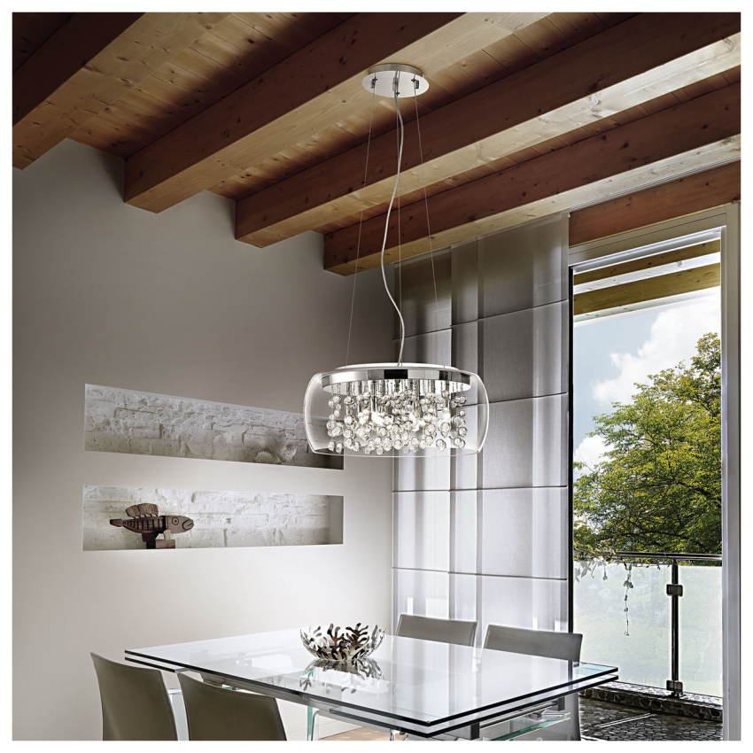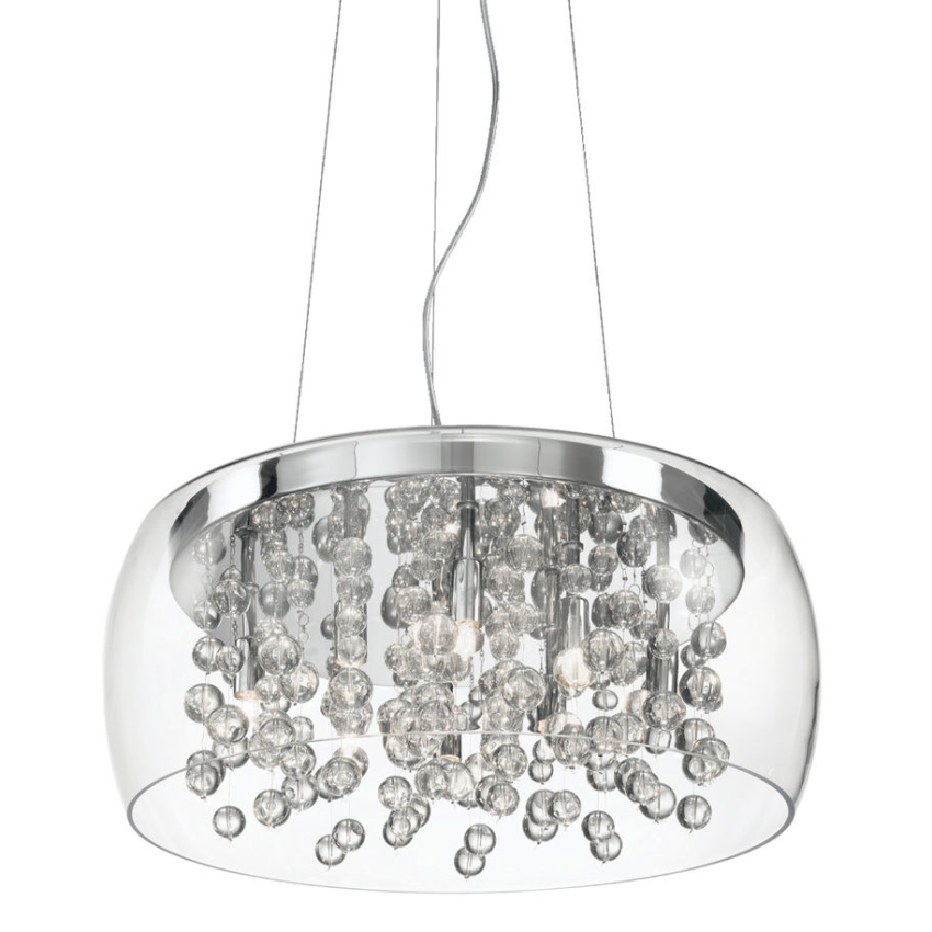 Závěsná lampa složená z kovového rámu a skleněných koulí uprostřed masivního čirého skla.