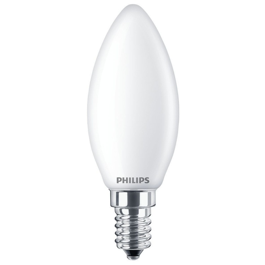 Svíčková LED žárovka Philips CorePro LEDcandle s paticí E14 a mléčně bílou baňkou FR ve tvaru svíčka B35 o příkonu 6,5 W nahrazuje obyčejnou 60 W žárovku. Vydává krásné rozptýlené teplé bílé světlo 2700 K se světelným tokem 806 lm, které nelze stmívat.