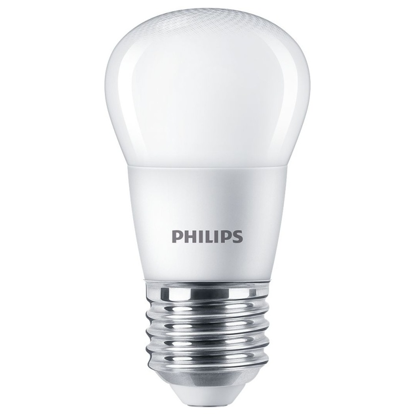 Lustrová LED žárovka Philips CorePro Lustre s paticí E27 a mléčně bílou baňkou ve tvaru kapka P45 o příkonu 5 W nahrazuje obyčejnou 40 W žárovku. Vydává rozptýlené příjemné teplé bílé světlo 2700 K se světelným tokem 470 lm. Nelze ji stmívat.