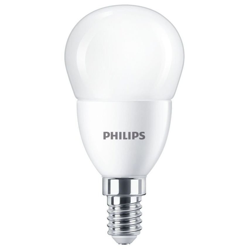 Lustrová LED žárovka Philips CorePro lustre s paticí E14 a mléčně bílou baňkou FR ve tvaru kapka P48 s příkonem 7W nahrazuje obyčejnou 60W žárovku a svítí rozptýleným nestmívatelným jasným neutrálním denním bílým světlem 4000 K se světelným tokem 806 lm.