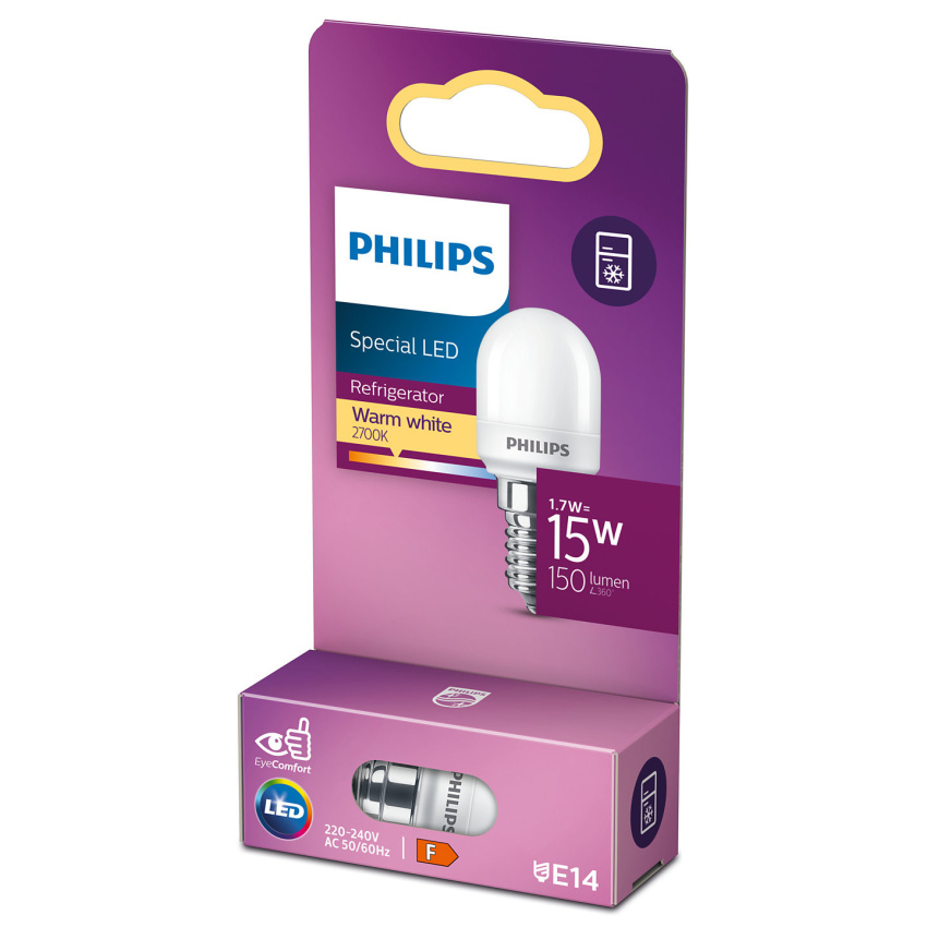 LED žárovka Philips EyeComfort bez problikávání pro použití do chladničky ve variantě s matně bílou baňkou FR T25 s paticí E14 o příkonu 1,7 W s úsporným teplým bílým světlem 2700 K nahrazuje 15 W lednicovou halogenovou žárovku.