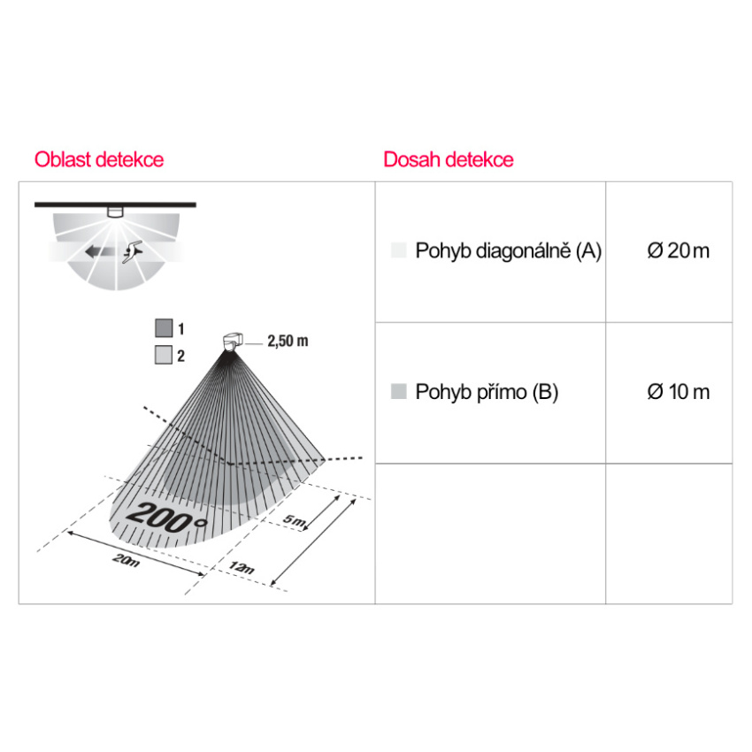 Dosah čidla lze regulovat také sklopením otočné hlavy senzoru, max. 80°, lze nastavit mechanicky přes potenciometr.