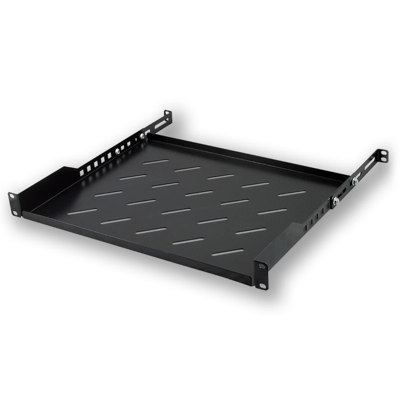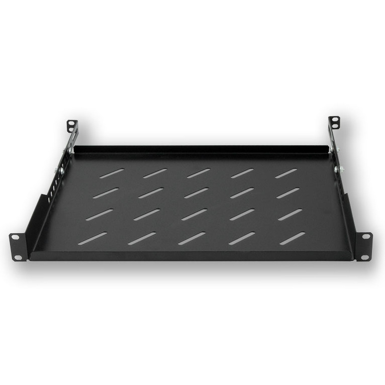 Polička 19" s perforací, výška 1U, montáž do předních lišt s nosností do 60 kg, zadní podpěry.