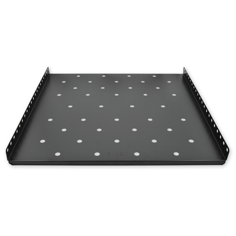 Polička 19" s perforací pro stojanové rozvaděče, výška 1U, hloubka 275 mm je určena pro montáž do bočních lišt s nosností do 60 kg, barva černá.