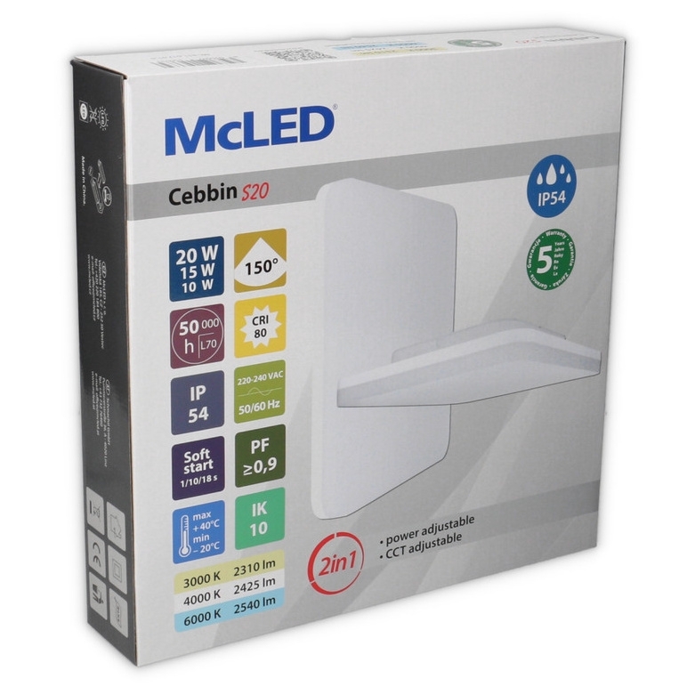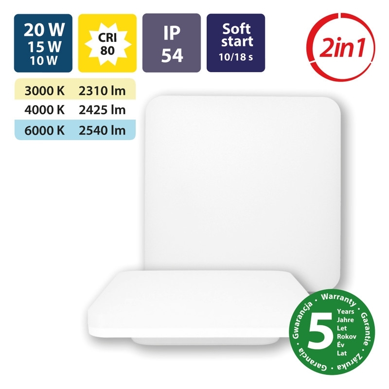 LED stropní svítidlo 20W bílé, 230V, IP54, 3CCT - teplá, neutrální nebo studená bílá, max. světelný tok 2310lm/3000K, 2425lm/4000K, 2540lm/6000K, vyzařovací úhel 150°, CRI 80, životnost 50.000h, rozměry 320x320x57mm, materiál plast, mléčný difuzor, nestmívatelné, PF>0,9, s přepínači výkonu 20/15/10W, teploty chromatičnosti 3000/4000/6000K a doby náběhu ≤1/10/18s