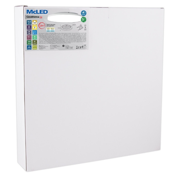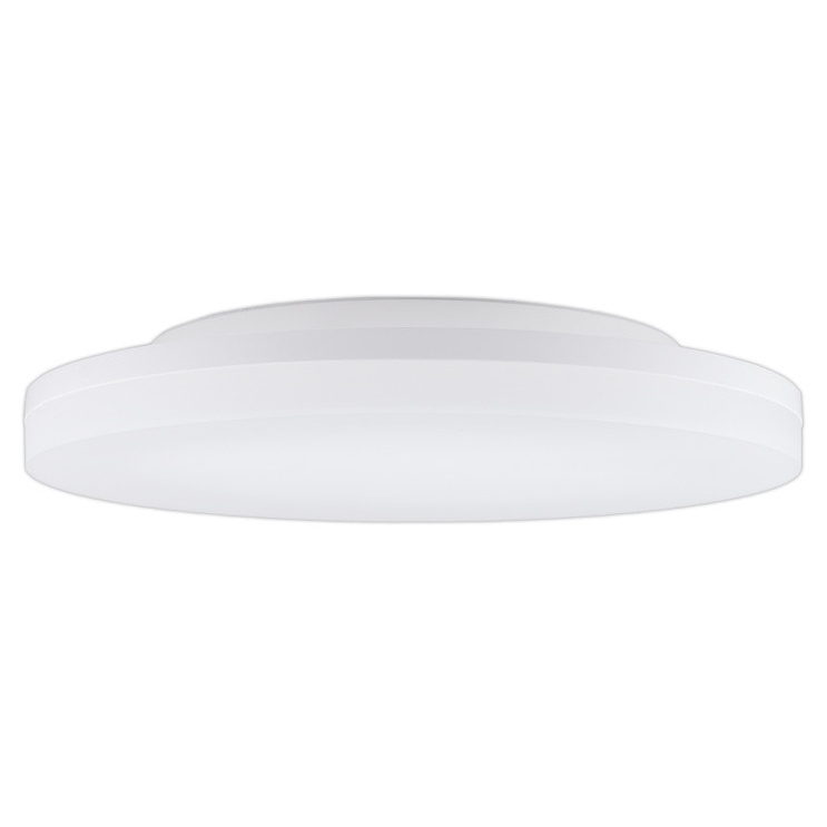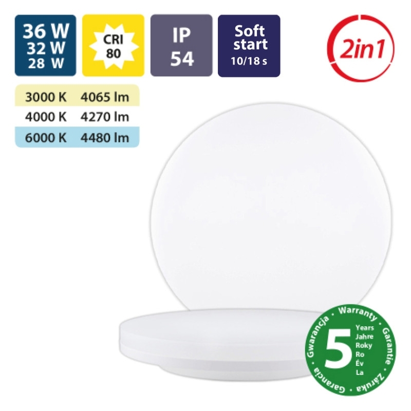 LED stropní svítidlo 36W bílé, 230V, IP54, 3CCT - teplá, neutrální nebo studená bílá, max. světelný tok 4065lm/3000K, 4270lm/4000K, 4480lm/6000K, svíticí přímo/nepřímo (95/5%), vyzařovací úhel 150°, CRI 80, životnost 50.000h, rozměry ø450x57mm, materiál plast, mléčný difuzor, nestmívatelné, PF>0,9, s přepínači výkonu 36/32/28W, teploty chromatičnosti 3000/4000/6000K a doby náběhu ≤1/10/18s, v rámci volitelného příslušenství lze dokoupit sadu pro zavěšení svítidla