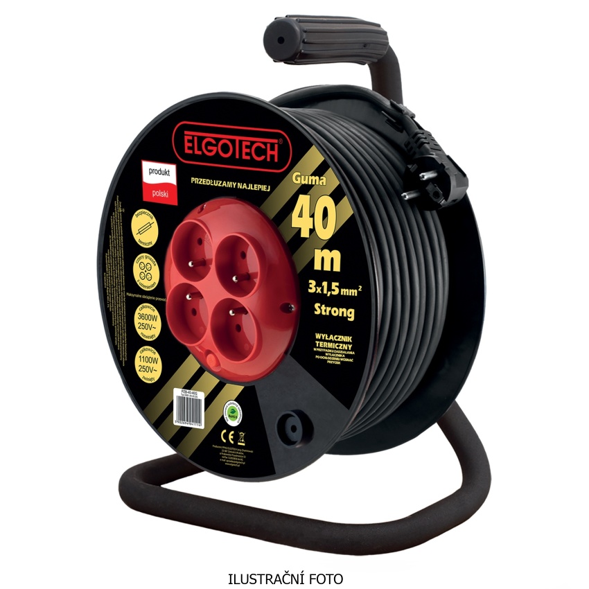 Prodlužovací buben PZB-40-50G délky 50m, s vodiči 3x1,5mm, materiál izolace H05RR-F (Guma), 4x kulatá zásuvka s uzemněním, resetovatelná tepelná pojistka, stupeň krytí IP20.
