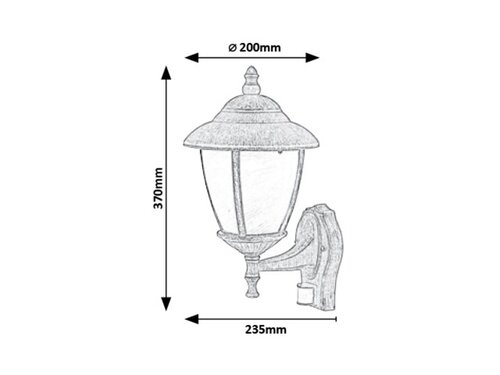 Venkovní nástěnné svítidlo Madrid je vybaveno snímačem pohybu a je jedním ze zástupců klasického stylu. Starožitná zlatá lampa je vyrobena z kovu a skla a její stínítko je alabastr. Může být použita se zdrojem světla do 60 W, závit typu E27. Senzor detekuje pohyb ze vzdálenosti 3-8 metrů pod úhlem 120 °. Díky senzoru pohybu svítidlo Madrid nepracuje za denního světla, takže šetří energii. Nástěnné svítidlo má následující rozměry: výška 370 mm, průměr v nejširším bodě 200 mm, vzdálenost od stěny 235 mm. Venkovní svítidlo má krytí IP43, takže je chráněno proti pronikání předmětů do průměru 1 mm, jakož i proti dešťové vodě do 60 °.