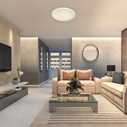 Díky mnoha dalším vlastnostem stropního svítidla Danny s třpytivým efektem je to skvělá volba pro ty, kteří nejsou spokojeni s průměrným svítidlem. Moderní, elegantní bílý model je vyroben z kovu a plastu a má vestavěný zdroj světla LED. Spotřeba energie světelného zdroje je 60 W, jeho světelná intenzita je 4800 lumenů a jeho životnost je 30 000 hodin. Barevná teplota svítidla se podle potřeby může pohybovat od 3 000 do 6 500 K. To znamená, že může osvětlit danou místnost teplým bílým, přirozeným bílým nebo studeným bílým světlem. Svítidlo Danny je také stmívatelné, což znamená, že jeho jas lze nastavit podle přání a má také funkci časovače. Doporučujeme vám, aby ste toto skvělé stropní svítidlo použili ve svém obývacím pokoji, ložnici nebo dokonce na chodbě. Dálkově ovládané, kulaté svítidlo má průměr 600 mm a vzdálenost 75 mm od stropu. Na stropní svítidlo Danny se poskytuje záruka 5 let.