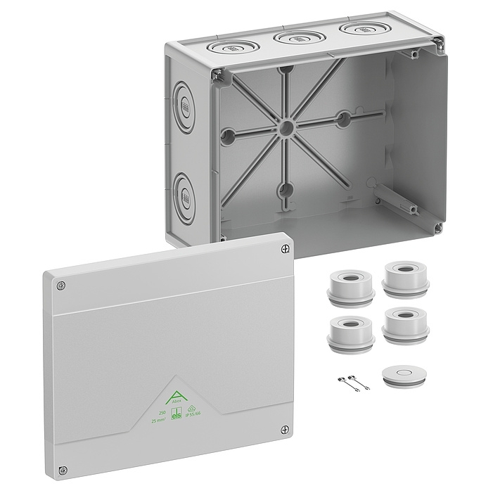 Rozbočovací krabice, se stupněm krytí IP55/IP66, Jmenovitý průřez 25 mm², Certifikováno VDE (DIN EN 60670-1/-22 (VDE 0606-1/-22)), DLG (odolnost vůči čpavku), Vyrážecí membrány, M20/M25/M40/M50, (4 prolis ze zadu, 10 vývodek z boku), Vnitřní místa pro připevnění, pro standardní instalace ve vnitřním prostoru a chráněném venkovním prostředí