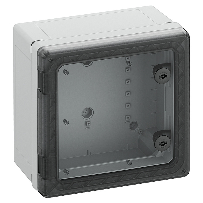 Skříň, vhodná pro instalaci v náročných prostředích a na exponovaných venkovních místech, krabice a rám: polykarbonát vyztužený skelnými vlákny, šedý, podobný RAL 7035, dveře: polykarbonát.