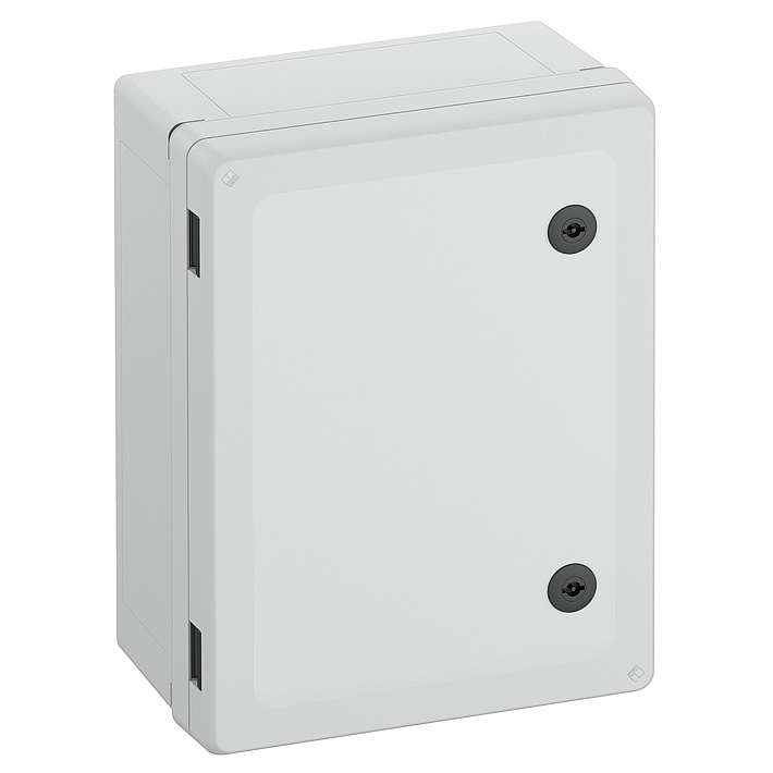 Skříň, vhodná pro instalaci v náročných prostředích a na exponovaných venkovních místech, krabice a rám: polykarbonát vyztužený skelnými vlákny, šedý, podobný RAL 7035, dveře: polykarbonát.