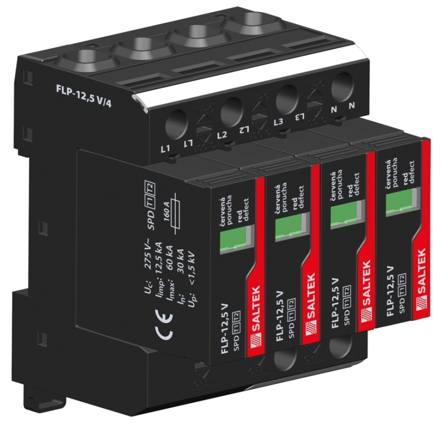 SPD typu 1 a typu 2 – svodič bleskových proudů a přepětí, vyjímatelný modul, optická signalizace poruchy, možnost blokace modulu.