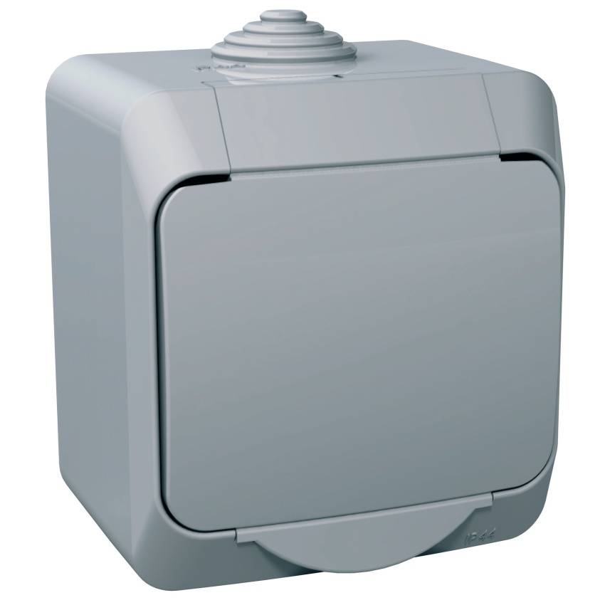 Jednonásobná zásuvka 2P+PE IP44 norma VDE, v šedé barvě.