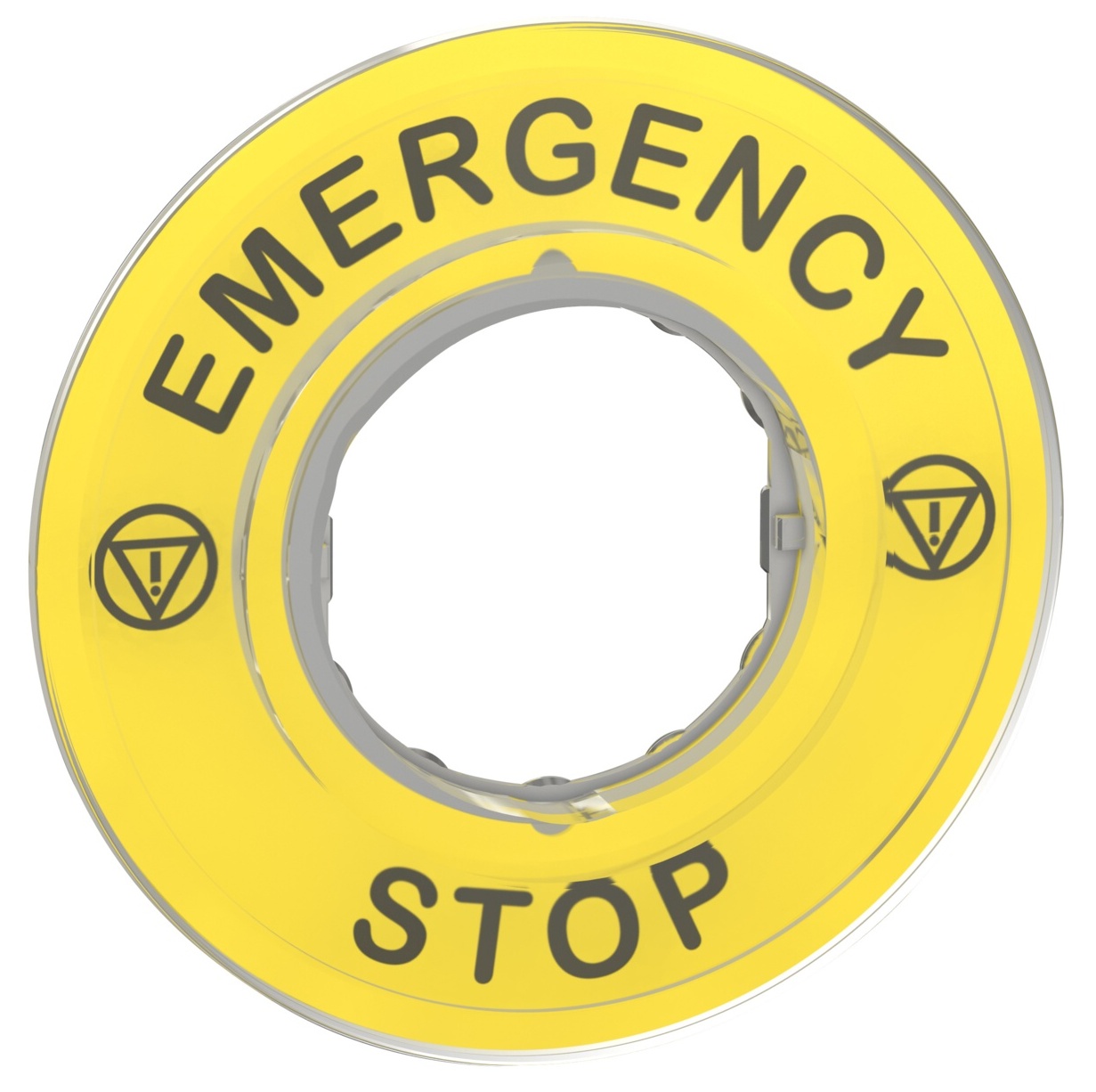 Kruhový štítek pro nouzové zastavení typu Harmony má žluté pozadí a je označen písmenem "ARRET D'URGENCE"a průměrem 60 mm.