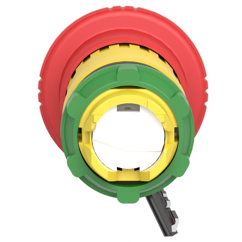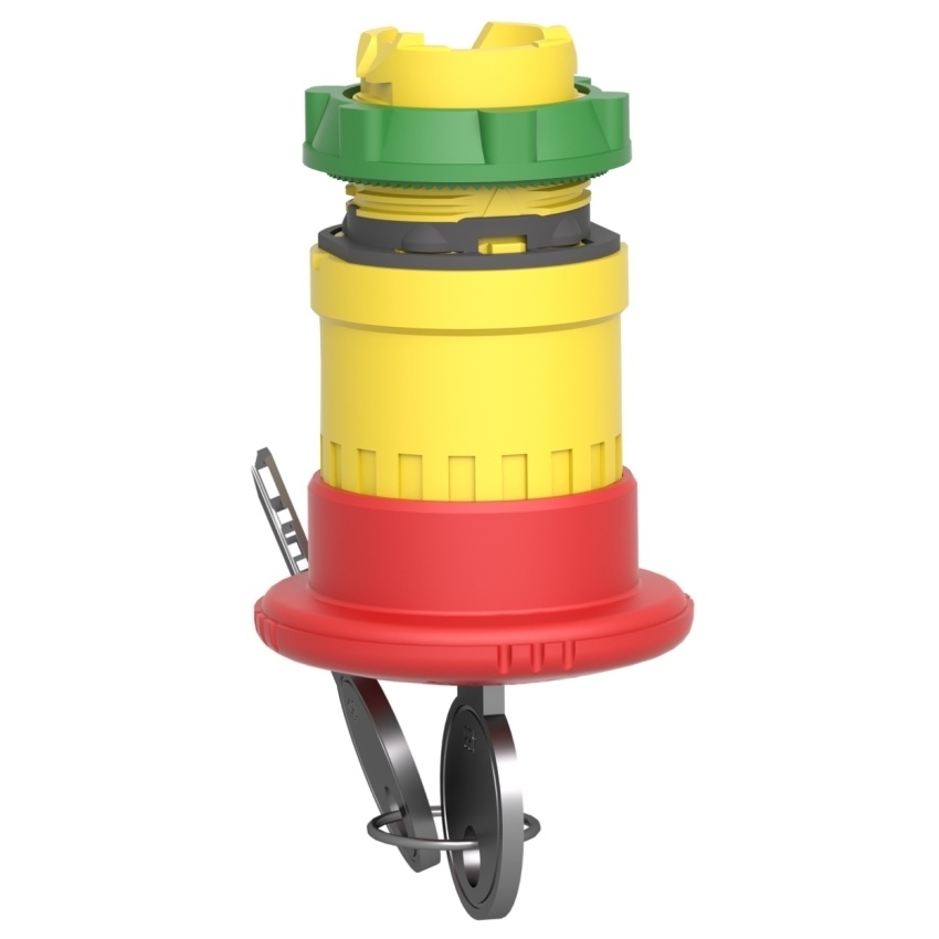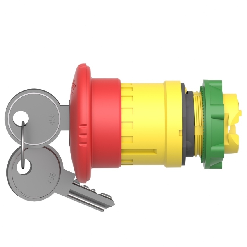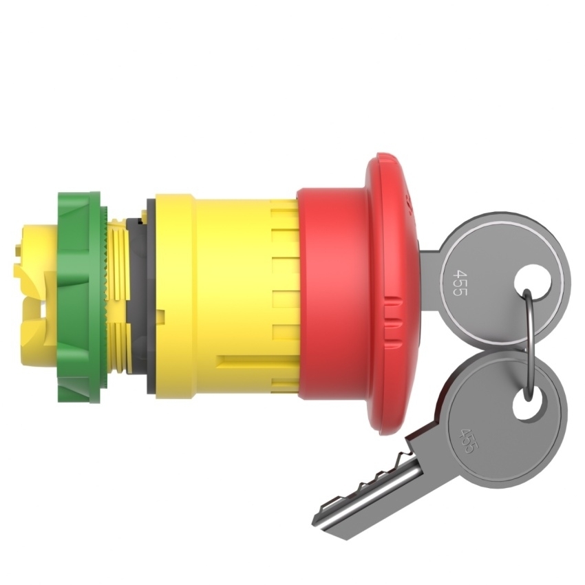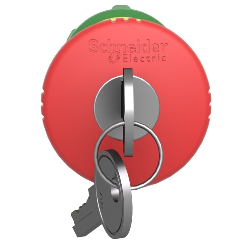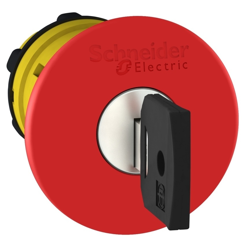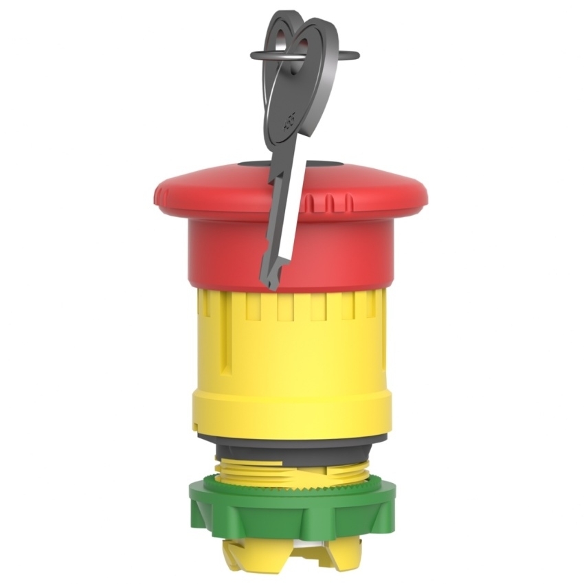 Červená Ø40 ovl.hlav.stisk.nouz.zastav.Ø22 vypnuto a s aretací "uvolnit klíčem"