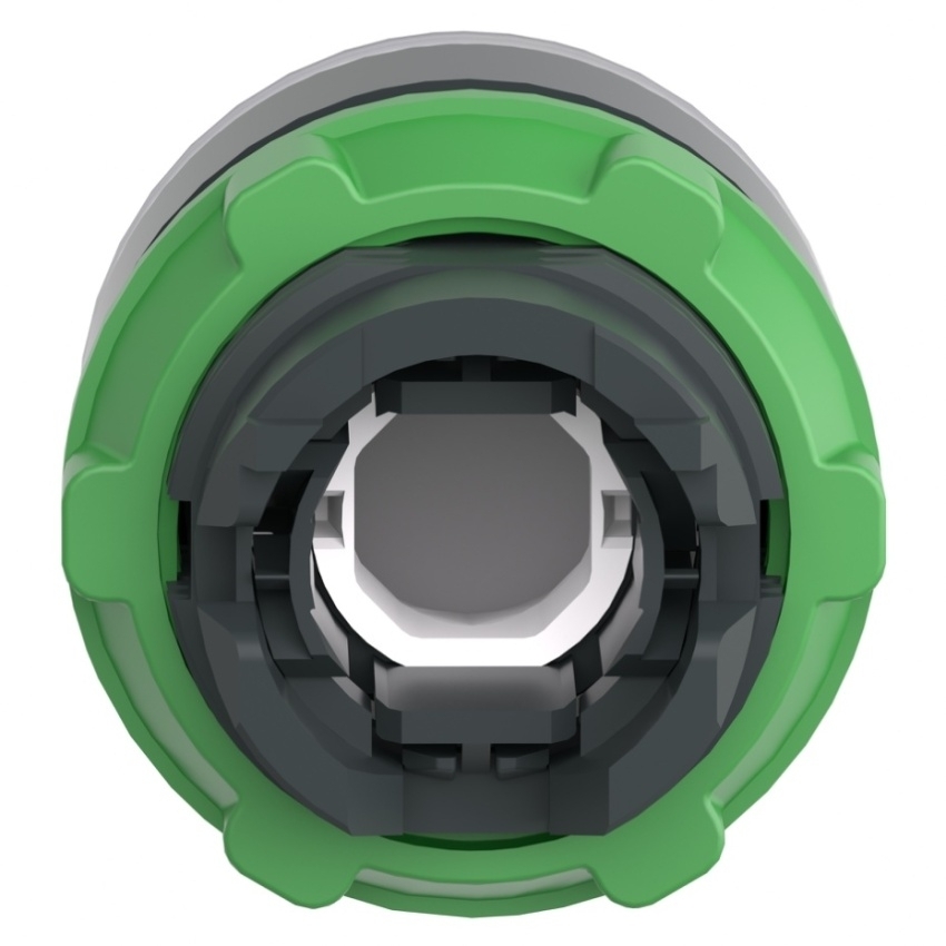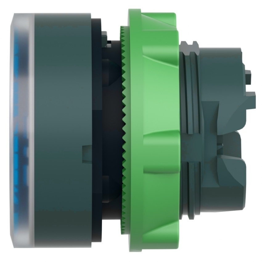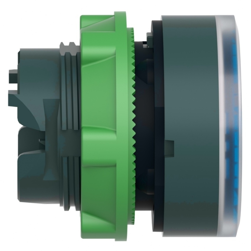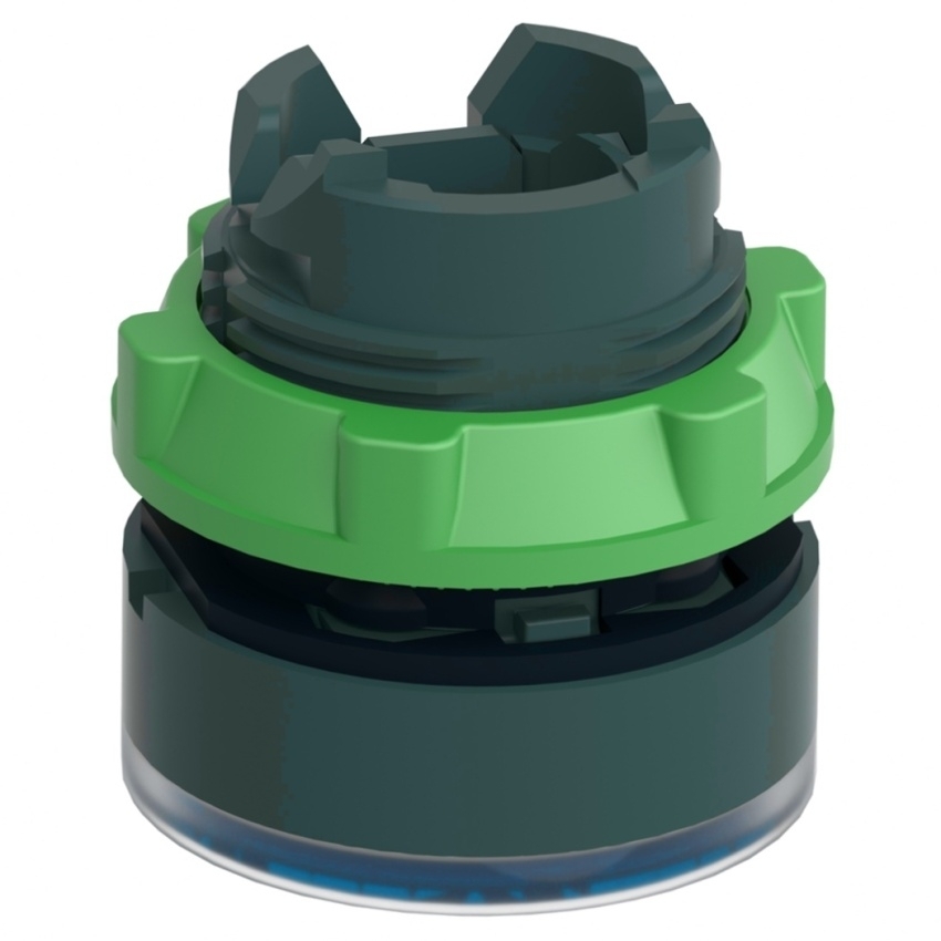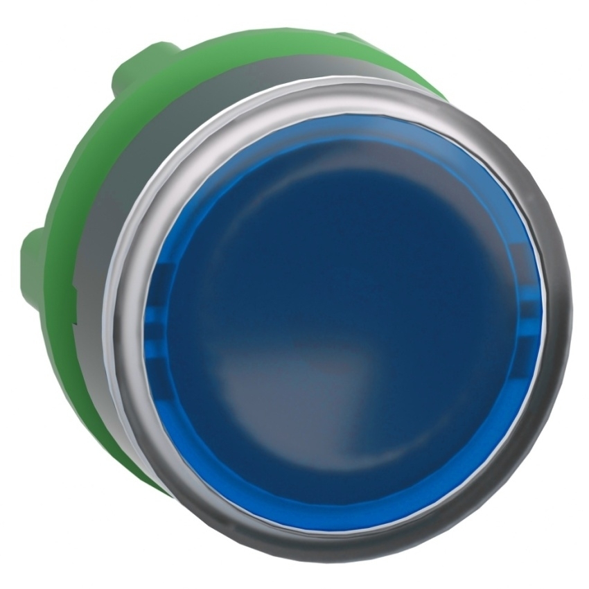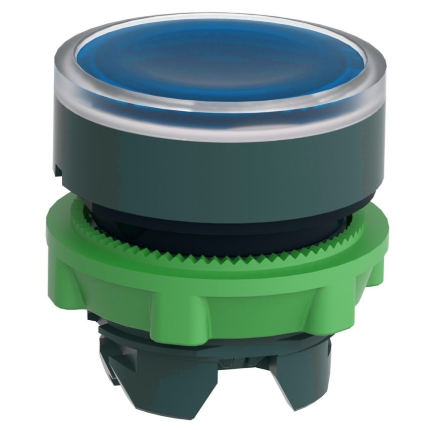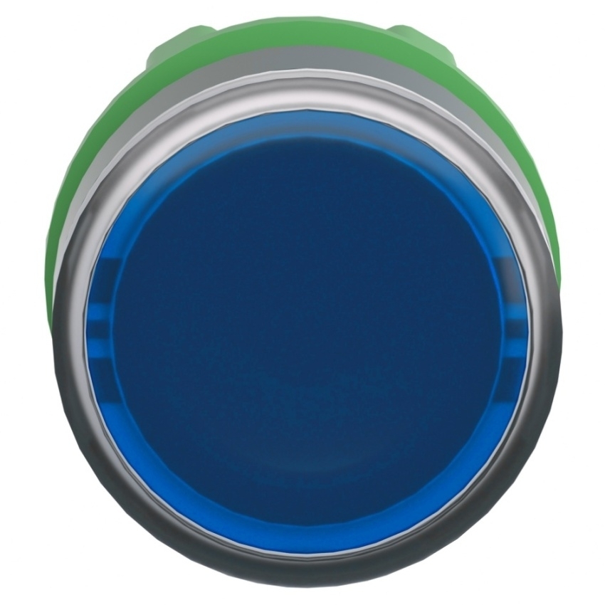 Modrá ovl. hlavice stiskací prosvět., lícující Ø22 s návratem pro integ. LED