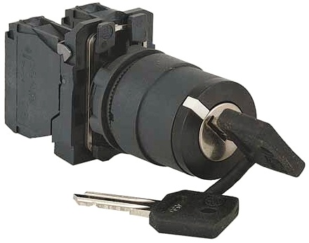 Modulární černý ovládač s klíčkem (klíč č. 455), má 2 polohy, funguje s aretovaným mechanismem s klíčem k vytažení zleva a používá šroubové svorky.