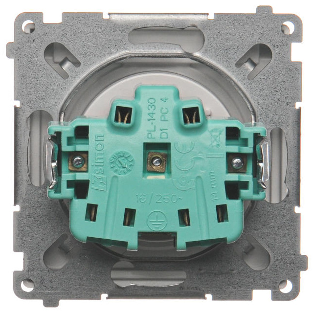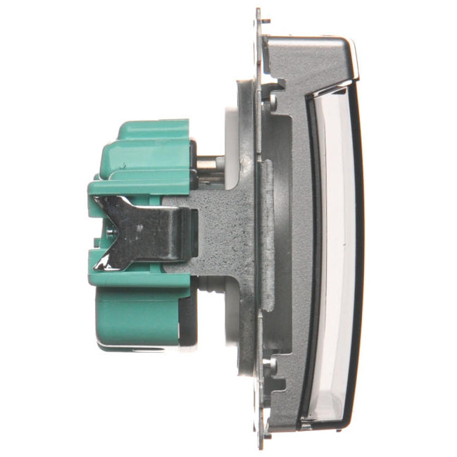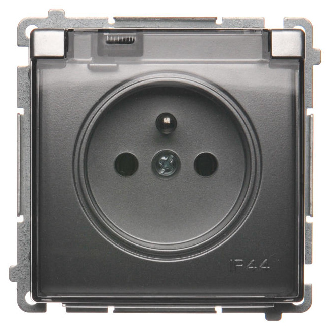 Zásuvka jednonásobná IP44 s uzemněním, 16 A, 250 V~ (strojek s krytem), šroubové svorky, s průhledným víčkem, Stříbro