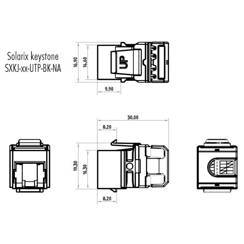 Keystony produktové řady Solarix – kategorie 5E s označením SXKJ-5E-UTP-BK-NA jsou keystony, u kterých je důraz kladen především na rychlost a jednoduchost zařezání. Tyto keystony lze zařezat speciálními kleštěmi, které významně zkracují čas instalace. Keystony jsou dostupné ve stíněném i nestíněném provedení a bez problémů splňují požadavky definované v mezinárodních standardech ANSI/TIA 568, ISO/IEC 11801 a EN 50173 pro kategorii 5E a třídu vedení Class D, včetně všech nejnovějších dodatků. Standardní barva nestíněných keystonů je černá, u stíněné verze je tělo modulu opatřeno stříbrnou kovovou částí. Kleště s označením SXKJ-NA-BU je nutné dokoupit zvlášť a lze je použít pouze na tento typ keystonů (tj. SXKJ-xx-yyy-BK-NA). Stejně jako všechny komponenty v produktové skupině Solarix – kategorie 5E jsou i tyto rychlozařezávací keystony vyrobeny tak, aby poskytovaly maximální životnost, vynikající výkon, spolehlivost a především jednoduchou instalaci. Nestíněné keystony jsou navíc vybaveny speciální protiprachovou krytkou. Díky svým kompaktním rozměrům jsou tyto rychlozařezávací keystony kompatibilní s modulárními zásuvkami většiny výrobců (např. ABB, Schneider, Legrand, Moeller, Hager, Obzor atd.). Tuto kompatibilitu si můžete ověřit v naší tabulce kompatibility keystonů Solarix.
