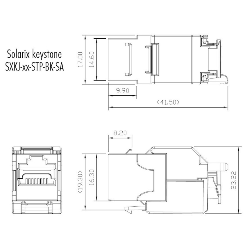 Samořezné keystony Solarix se vyznačují velmi jednoduchou instalací, ke které není nutné použít zařezávací nástroj. Tyto keystony bez problémů splňují parametry specifikované v mezinárodních standardech strukturované kabeláže ANSI/TIA 568, ISO/IEC 11801 a EN 50173 pro kategorii 6A a třídu vedení Class EA, včetně všech nejnovějších dodatků. Keystony jsou osazeny 180° samořeznou svorkovnicí, která je označena barevným schématem podle typu zapojení, a to buď podle standardu T568A, nebo T568B. Do této svorkovnice je možné zařezat kabely typu drát s vodiči o velikosti AWG 26 – 22. Standardní barva nestíněných samořezných keystonů Solarix je černá, u stíněné verze je tělo modulu opatřeno stříbrnou kovovou částí. Díky svým kompaktním rozměrům jsou tyto samořezné keystony kompatibilní s modulárními zásuvkami většiny výrobců (např. ABB, Schneider, Legrand, Moeller, Hager, Obzor atd.). Tuto kompatibilitu si můžete ověřit v tabulce kompatibility.