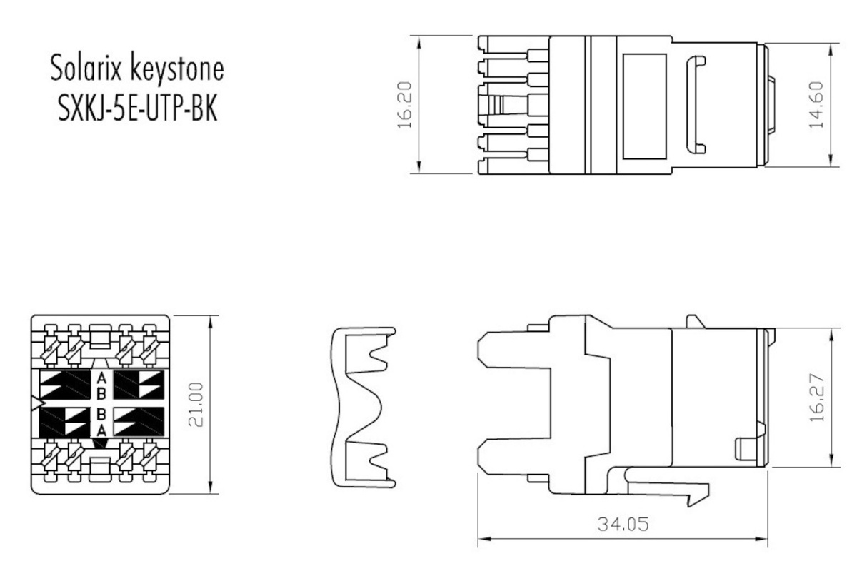 Zařezávací keystony produktové řady Solarix – kategorie 5E jsou dodávány jak v nestíněném, tak i ve stíněném provedení. Standardní barva u nestíněného keystonu je černá; v případě stíněného keystonu je tělo modulu opatřeno stříbrnou kovovou částí. Oba tyto typy keystonů převyšují požadavky definované ve standardech ANSI/TIA 568, ISO/IEC 11801 a EN 50173 pro kategorii 5E a třídu vedení Class D, včetně všech nejnovějších dodatků. Zařezávací keystony Solarix nabízí vysokou spolehlivost, maximální funkčnost a jednoduchou instalaci. Kontakty duální svorkovnice typu 110/Krone jsou označeny barevným schématem podle způsobu zapojení, a to buď podle standardu T568A, nebo T568B. Do svorkovnice lze zařezat kabely typu drát s vodiči o velikosti AWG 26 – 22. Pro pohodlné a bezpečné zařezávání keystonů je k dispozici montážní držák SXKJ-MD-BU určený k zafixování keystonu na pracovní ploše (tj. při zařezávání není nutné držet keystone přímo v ruce). Díky svým kompaktním rozměrům jsou tyto zařezávací keystony kompatibilní s modulárními zásuvkami většiny výrobců (např. ABB, Schneider, Legrand, Moeller, Hager, Obzor atd.). Tuto kompatibilitu si můžete ověřit v tabulce kompatibility.