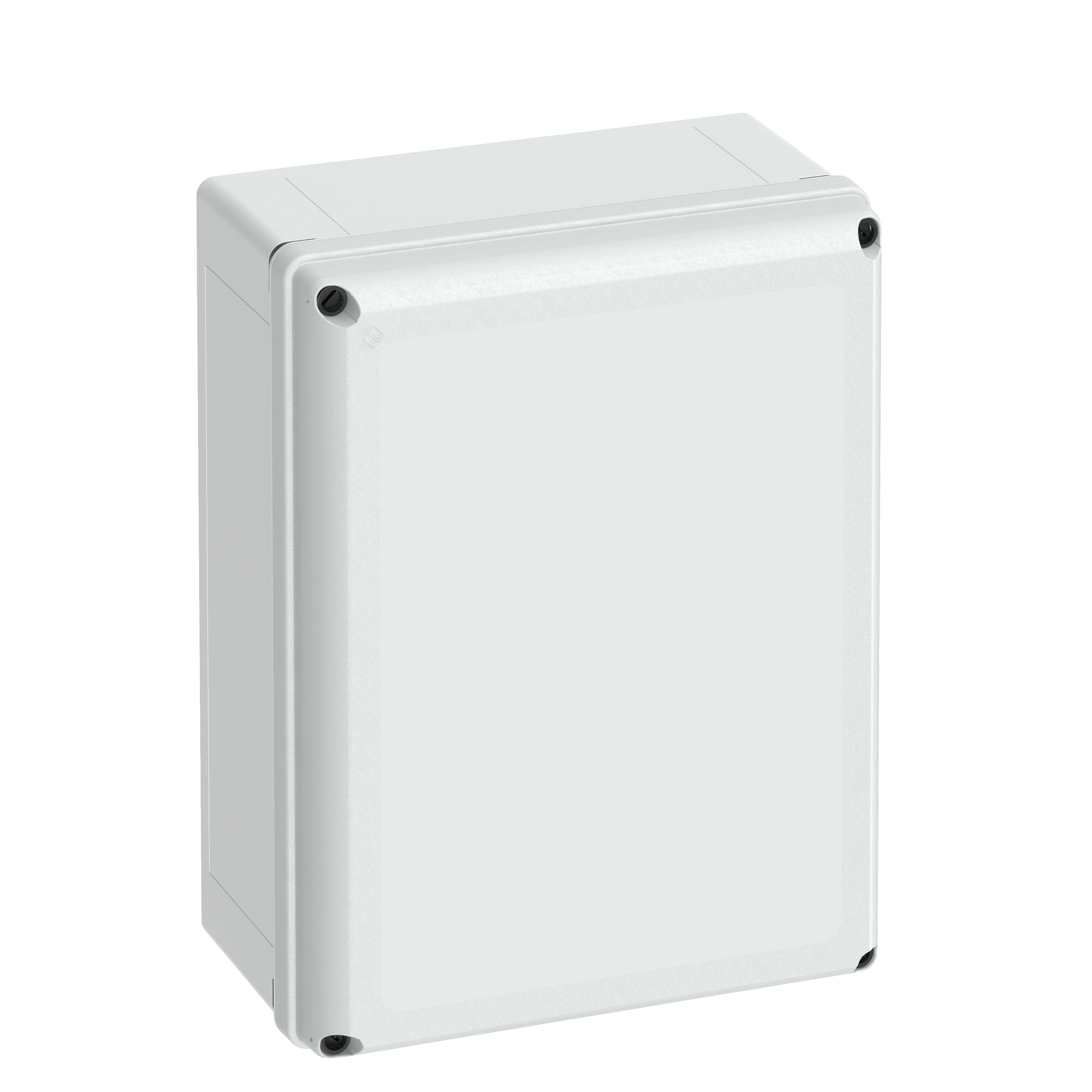 Prázdná skříň-průmyslová kvalita, vhodné pro instalaci v zátěžovém prostředí a v nechráněném venkovním prostředí, Krabice: polykarbonát vyztužený skleněnými vlákny, šedá, podobně RAL 7035, Víko: Polykarbonát, s šedým víkem