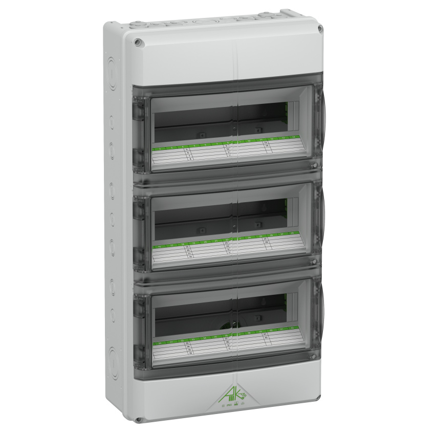 Trojřadý polykarbonátový rozvaděč od Spelsberg pro 42 modulů s mezemi 150mm mezi kolejnicemi je vysoce kvalitní a začlenění Air technologie zajišťuje, že integrované ventilační prvky brání akumulaci kondenzační vody. V rozvaděčích řady AK jsou na horní straně umístěny pružné vstupy a je zde použita bezšroubová svorkovnice PE/N s šesti místy pro šroubování (2,5 - 16 mm²) a 42 místy pro bezšroubové upnutí (1,5 - 4 mm²). K těmto rozvaděčům lze také dokoupit různé krycí a popisovací pásky, doplňkové dvojité membránové vývodky a jiné příslušenství, které je možné najít v souvisejících produktech s přehlednými obrázky.