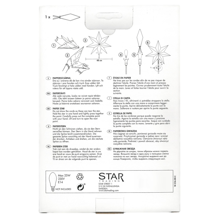 Papírová hvězda zlaté barvy s výřezy je skvělou dekorací do domácího interiéru. Je vhodná pro vnitřní instalaci umístěním na stojací nebo stolní lampu. Šířka papírové hvězdy je 48cm, délka - 48cm.