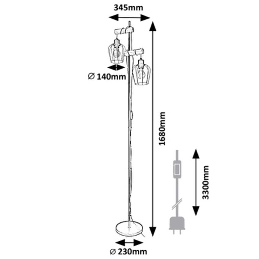 Stojící svítidlo Fabian v průmyslovém stylu bude jedinečným kouskem nábytku do obývacího pokoje nebo ložnice. Tento model sestávající z matného černého svítidla a zastíněných stínítek stejné barvy je vyroben z kovu a dřeva a je doplněn kulatou ozdobnou základnou. Dvojitý kabel svítidla je každý navinutý na dřevěném válci a dosahuje k hlavám svítidla skrývajíc se v tomto válci, což dodává tomuto modelu výrazný, surový vzhled. Světlo bez překážek proudí zespodu dolů visících klecovitých stínítek. Svítidlo Fabian je možné používat se dvěma žárovkami, každá s výkonem až 40W. Typ zásuvky je E27. Chcete-li v místnosti navodit útulnou, intimní atmosféru, vyberte si žárovky vyzařující teplé bílé světlo. Svítidlo Fabian je možné ovládat pomocí kabelového spínače. Délka kabelu je 3 300 mm. Rozměry tohoto stojícího svítidla jsou následující: šířka 345 mm, výška 1 680 mm, průměr každého stínítka je 140 mm. Tento model je dodáván bez světelných zdrojů.