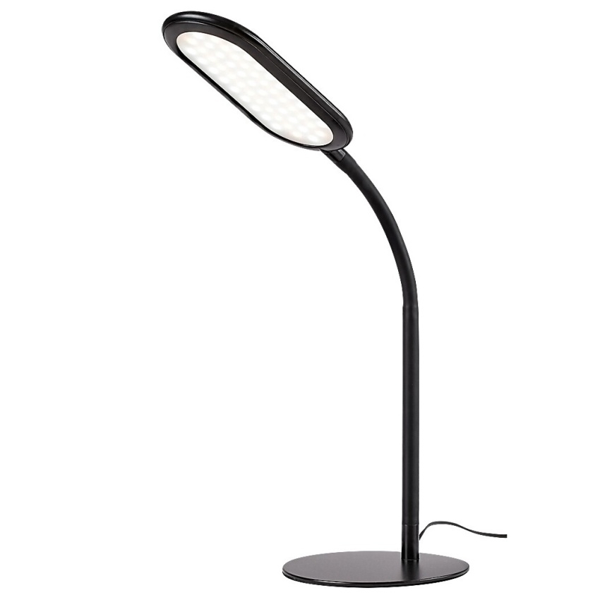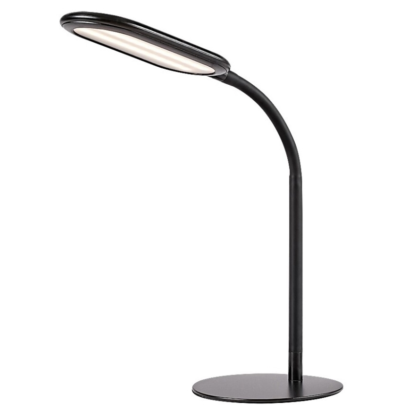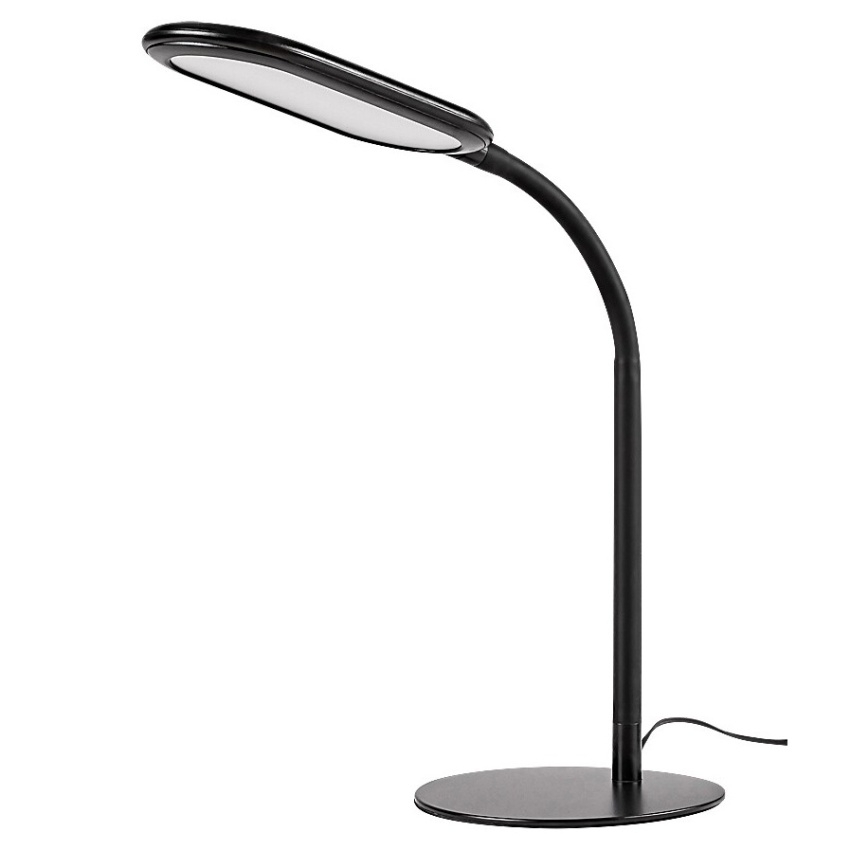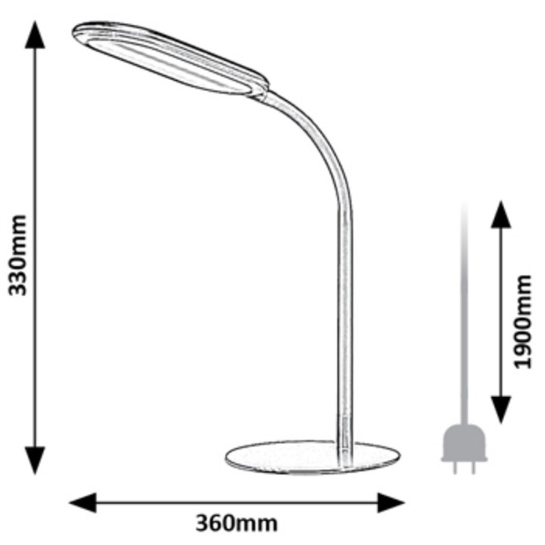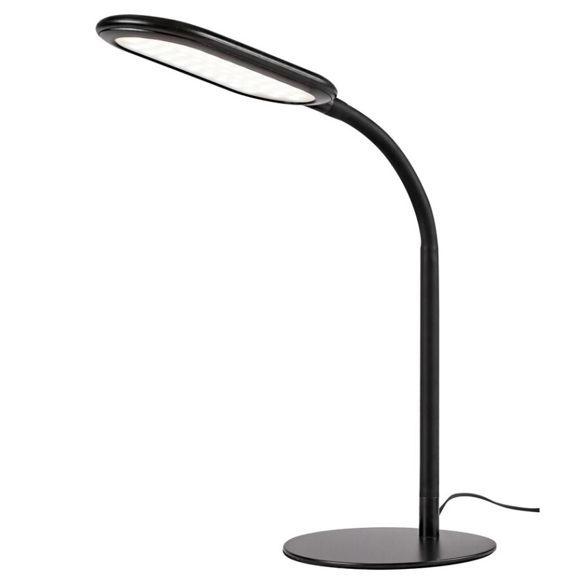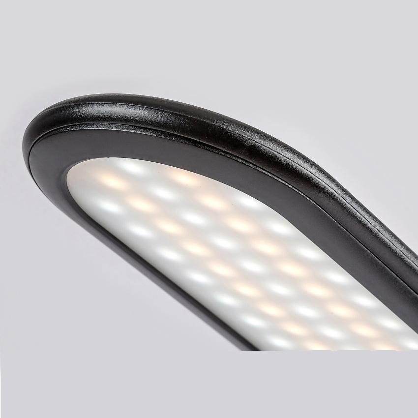 Stolní lampa Adelmo je díky svému jednoduchému, čistému designu a extra funkcím skvělou volbou na stůl každé moderní pracovny. Černý kovový model se vyznačuje štíhlým, zakřiveným stonkem a zcela plochou hlavou lampy, který ze strany vypadá skoro jako rovné prodloužení stonku. Lampa je doplněna bílým plastovým stínidlem a kulatou ozdobnou základnou. Adelmo má vestavěný LED světelný zdroj s výkonem 10 W a životností 20 000 hodin. Světelný tok svítidla je 910lm, světelný tok světelného zdroje je 1000lm. Teplotu barvy světelného zdroje lze pomocí dotykového spínače nastavit v rozmezí 3000-6000 K, to znamená, že lampa může svítit teplým, přirozeným nebo studeným bílým světlem. Šířka stolní lampy je 360 mm, výška 330 mm, délka kabelu 1900 mm.